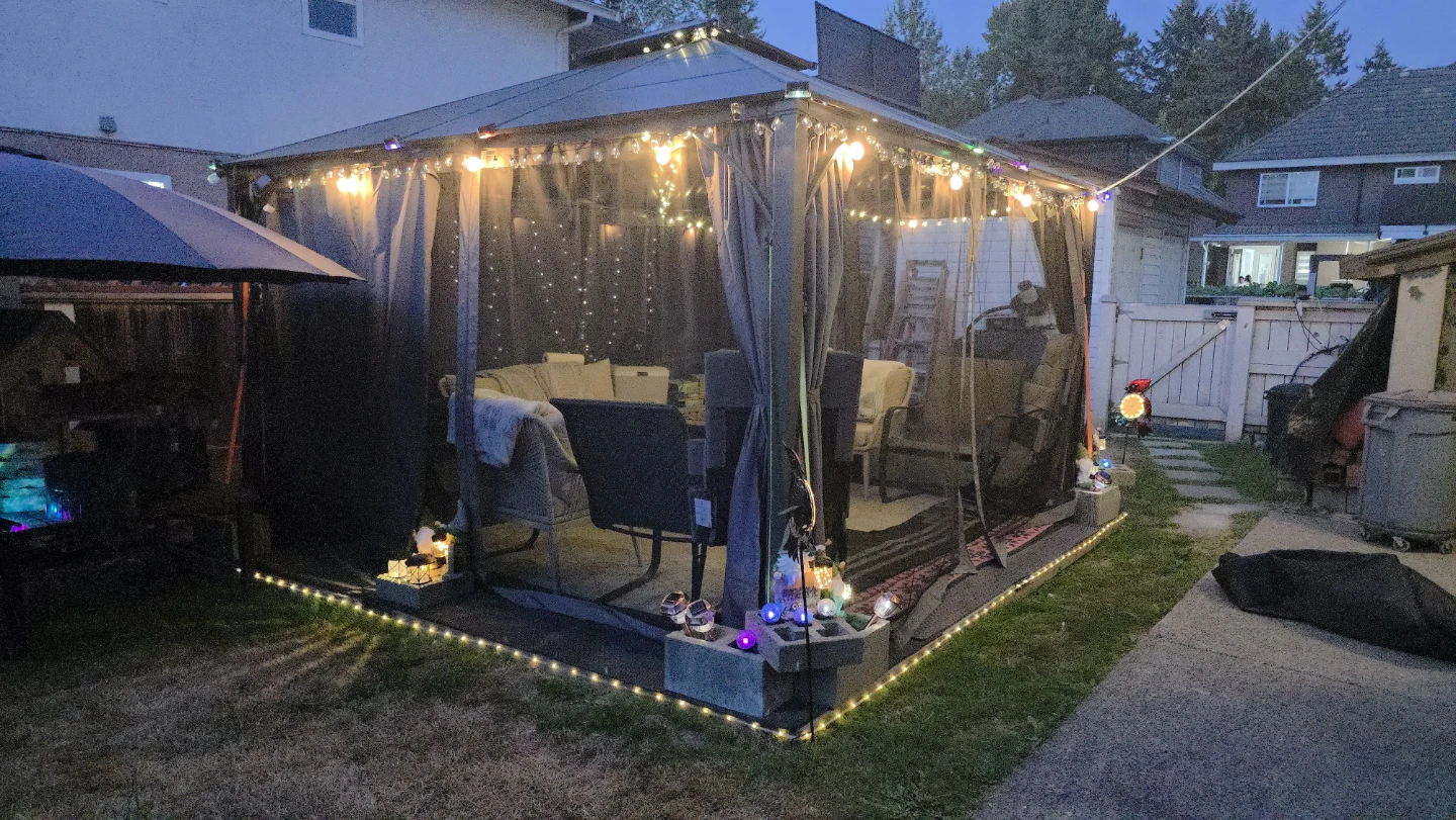 This gazebo is perfect for backyard gatherings. It comes with mosquito netting to keep bugs out. Provides a sheltered outdoor space for entertaining or relaxing.Used for 6 mos of one season. Disassembled ready to go in original box. Privacy panels got torn due to wind but repaired hence the price reduction other then that in brand new condition. Weatherproof polycarbonate Roof. Hardtop gazebo sturdy and stable structure practical mesh netting and privacy curtains, arch roof design with spacious space and ceiling hook.