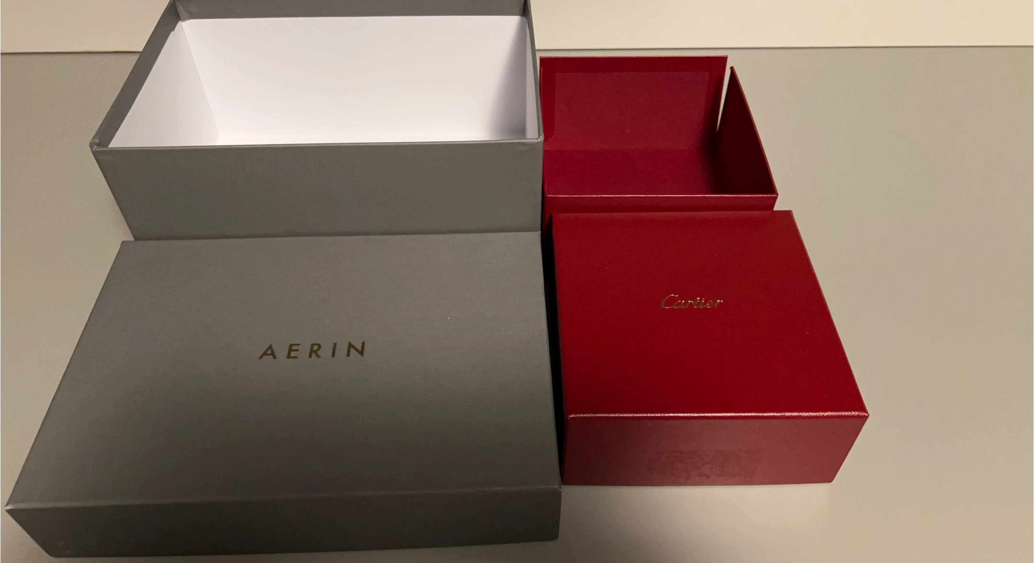Buy & SellAerin & Cartier Gift BoxesAerin & Cartier Gift Boxes$17Includes a gray Aerin box and a red Cartier box. These are decorative storage boxes.BrandAerin, CartierWHERE TO MEETCheck LocationView MapSELLERMariLaGuardia Airport281 review0 chats·0 favorites·6 viewsSEND CHAT TO SELLERHi Mari! I’m interested in your listing.Hi Mari! I’m interested in your listing.Get the Karrot app to chatSign In to chat