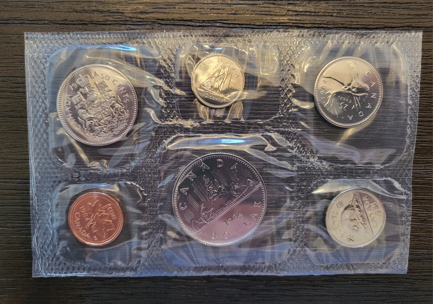 1984 Royal Canadian Mint (RCM) Uncirculated Coin Set. Still sealed in its original packaging, this set includes a dollar, 50-cent piece, 25-cent piece, 10-cent piece, 5-cent piece and a 1-cent piece.