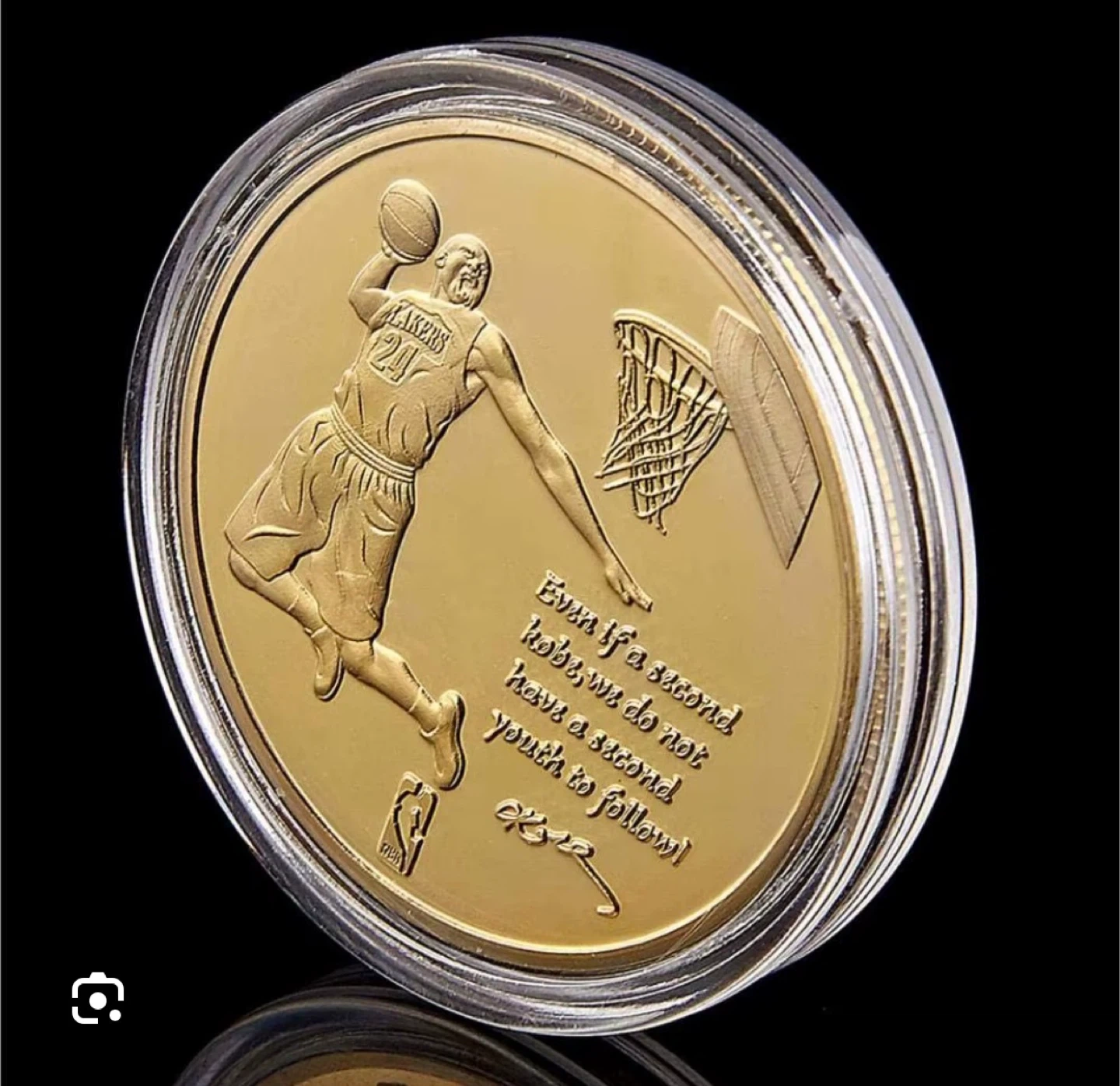 This is a commemorative coin featuring Kobe Bryant in his Lakers 24 jersey. It includes a quote about youth and following your path. The coin is gold-toned and comes in a protective clear case. Great for any basketball fan!