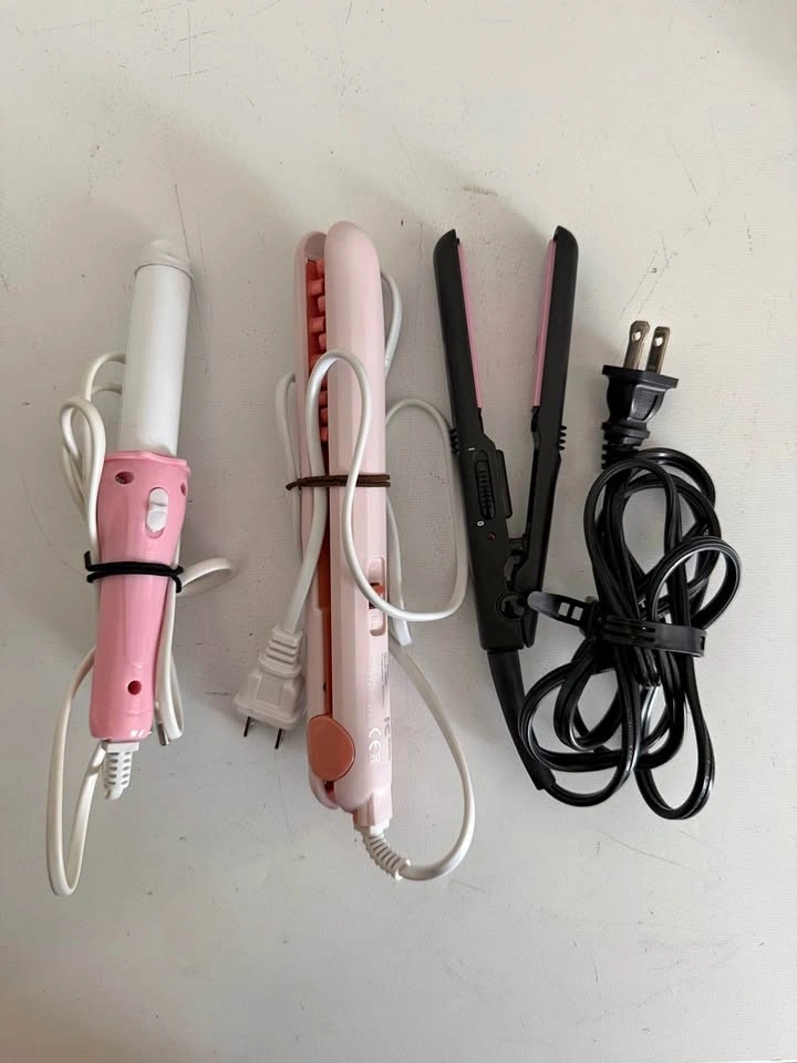 Brand New Set of 3 Hairstyling Tools (curler, straightener, crimper) - Perfect for Travel, Compact. Curler is combatible with European outlets, straightener compatible with North American outlets, crimper compatible with North American outlets.