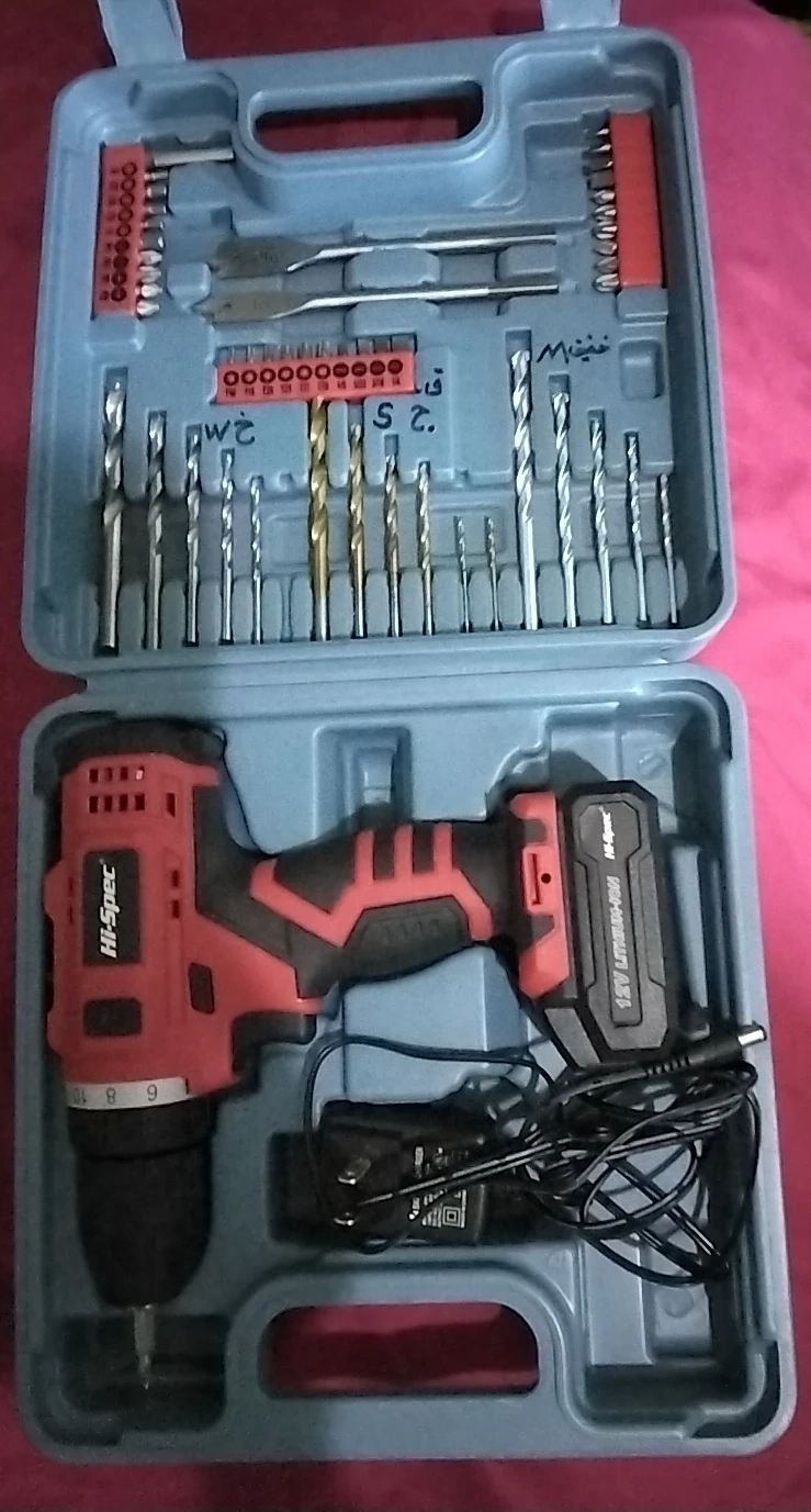 This is a Hi-Spec 12V cordless drill with a charger and a comprehensive drill bit set. It comes in a blue carrying case that keeps everything organized. The drill has multiple torque settings visible on the collar.