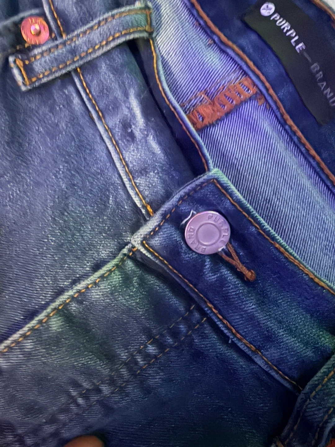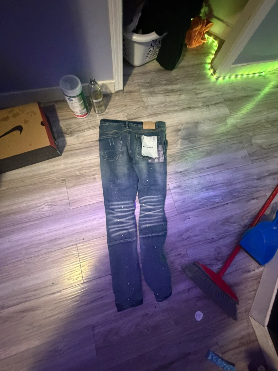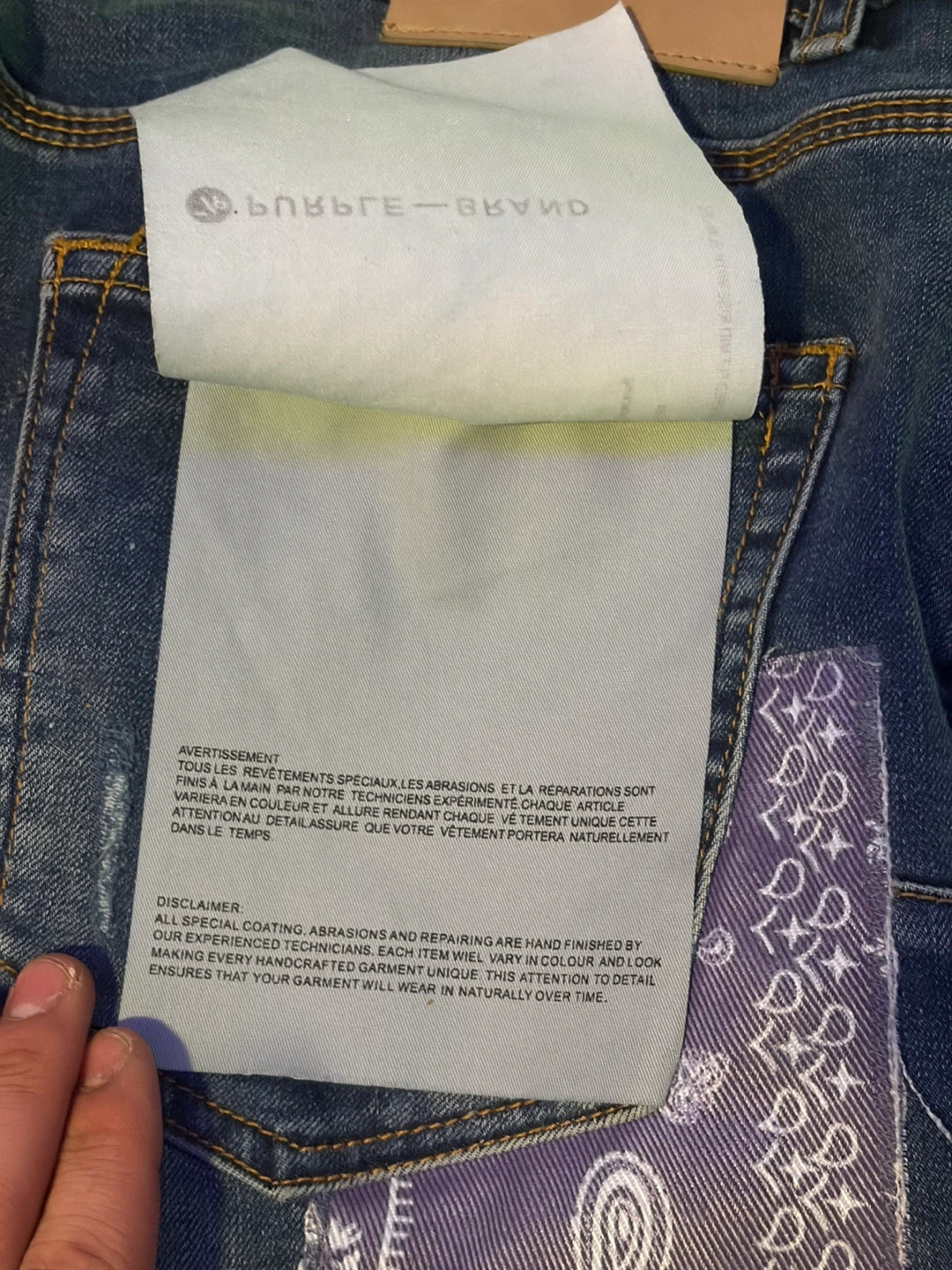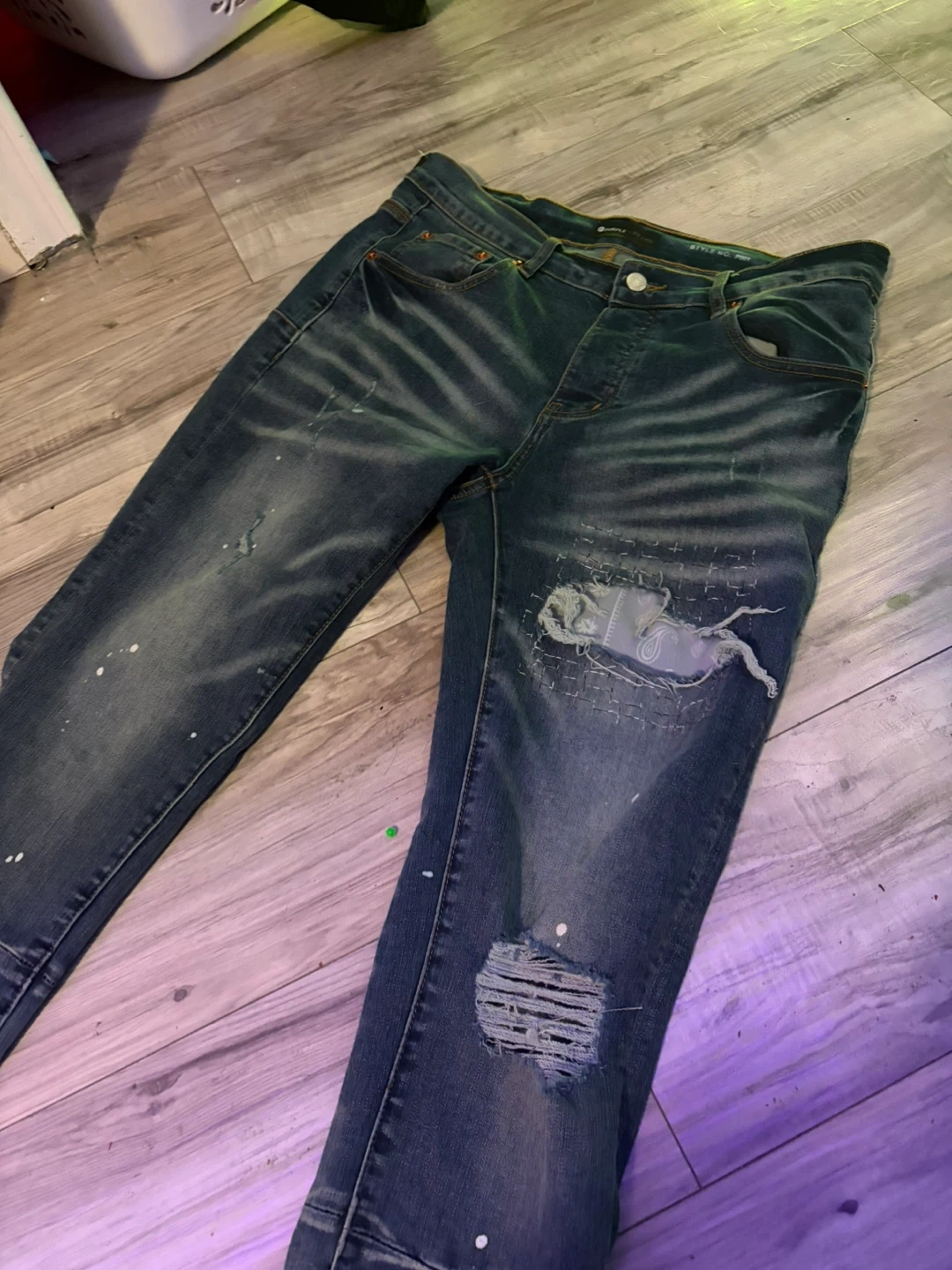 These are Purple Brand jeans in a dropped fit with a slim leg. The denim features paint splatters and distressed detailing. Special coating and repairs are hand-finished by experienced technicians, causing variations in colour and look. No front tag.