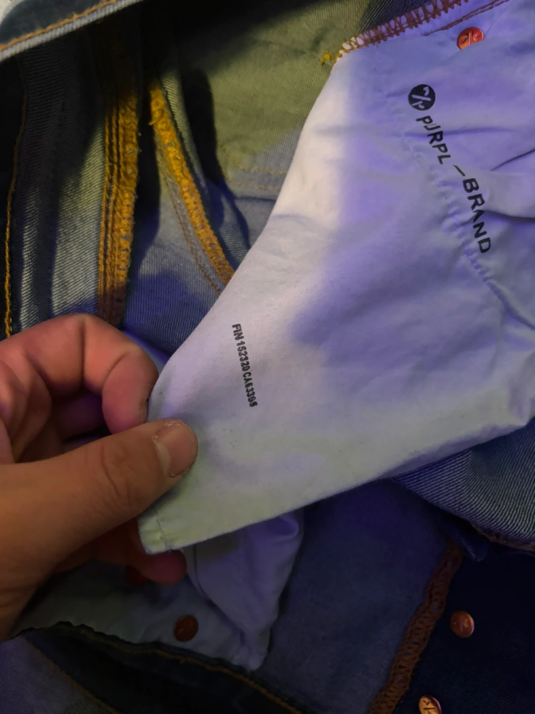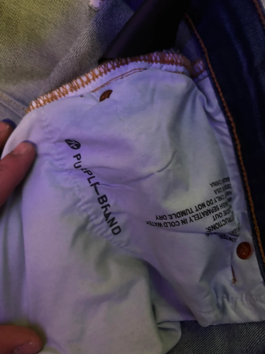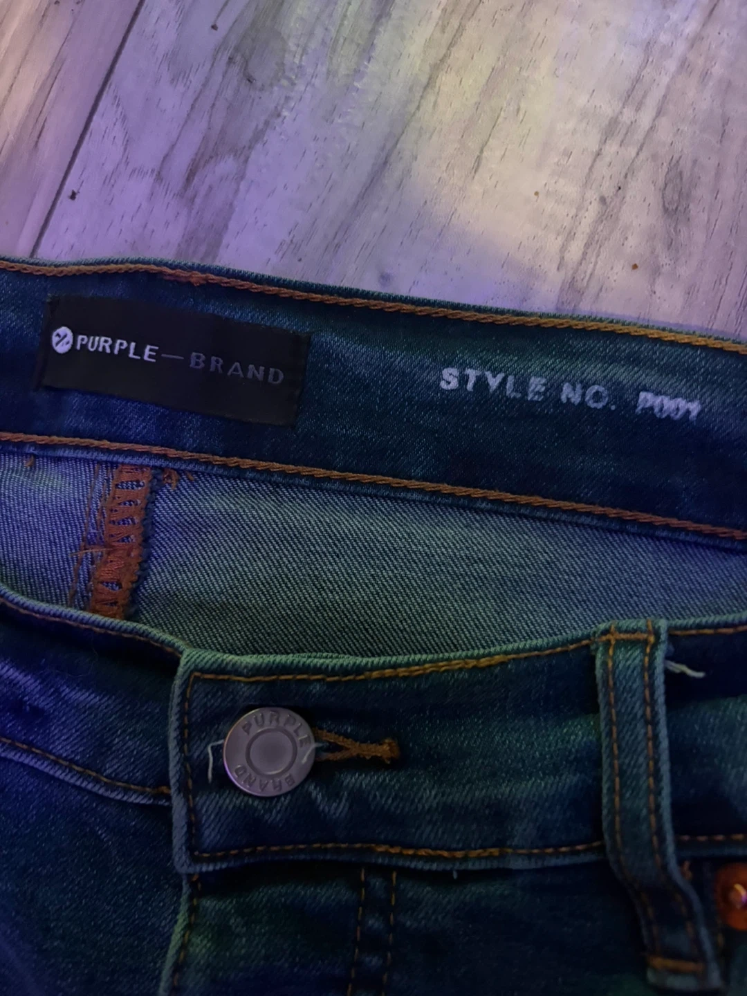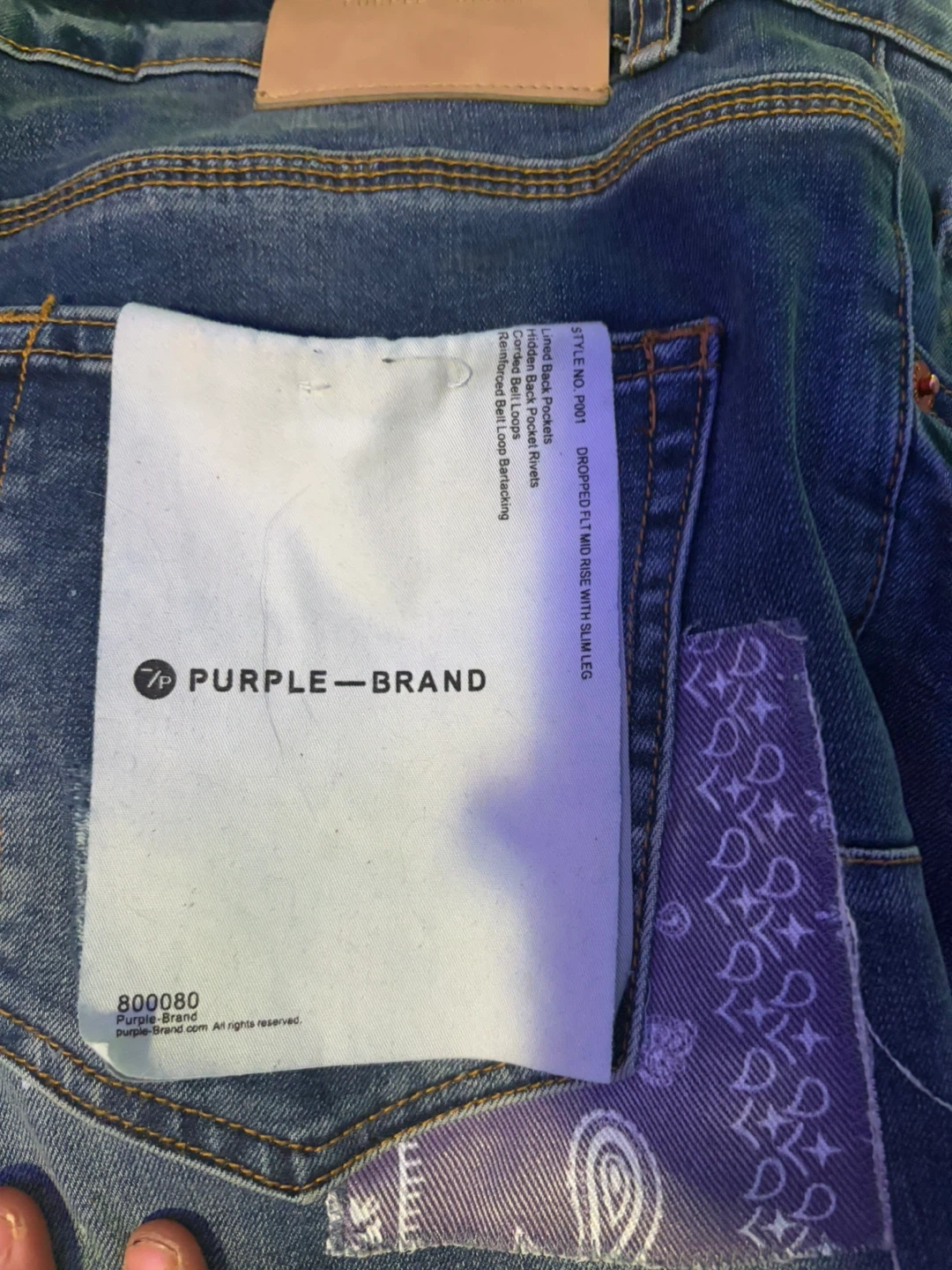 These are Purple Brand jeans in a dropped fit with a slim leg. The denim features paint splatters and distressed detailing. Special coating and repairs are hand-finished by experienced technicians, causing variations in colour and look. No front tag.