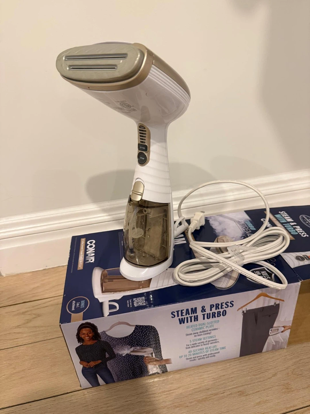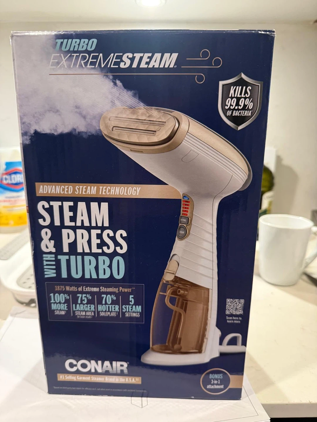 Conair Turbo ExtremeSteam handheld steamer in excellent condition. Powered by advanced steam technology with 5 adjustable steam settings and 1875W of strong steaming performance. Heats up in just 40 seconds and effectively removes wrinkles while killing 99.9% of bacteria. Compact, powerful, and perfect for home use or travel.