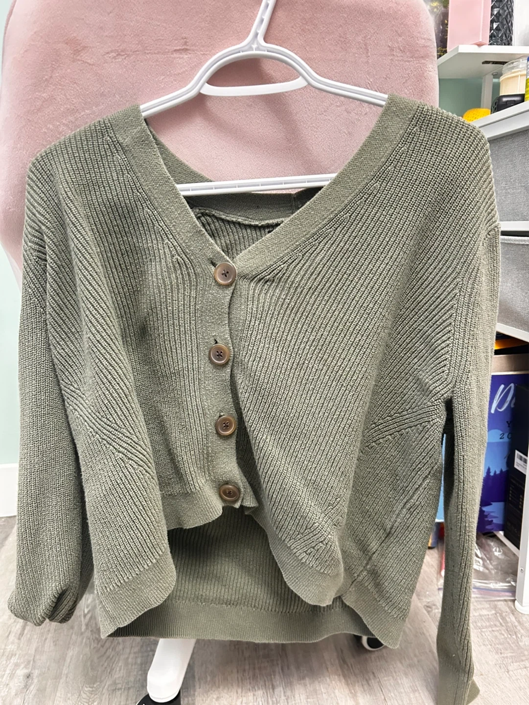 Olive green knit cardigan with button front. It's a comfortable and stylish layering piece. Made from a soft knit material.