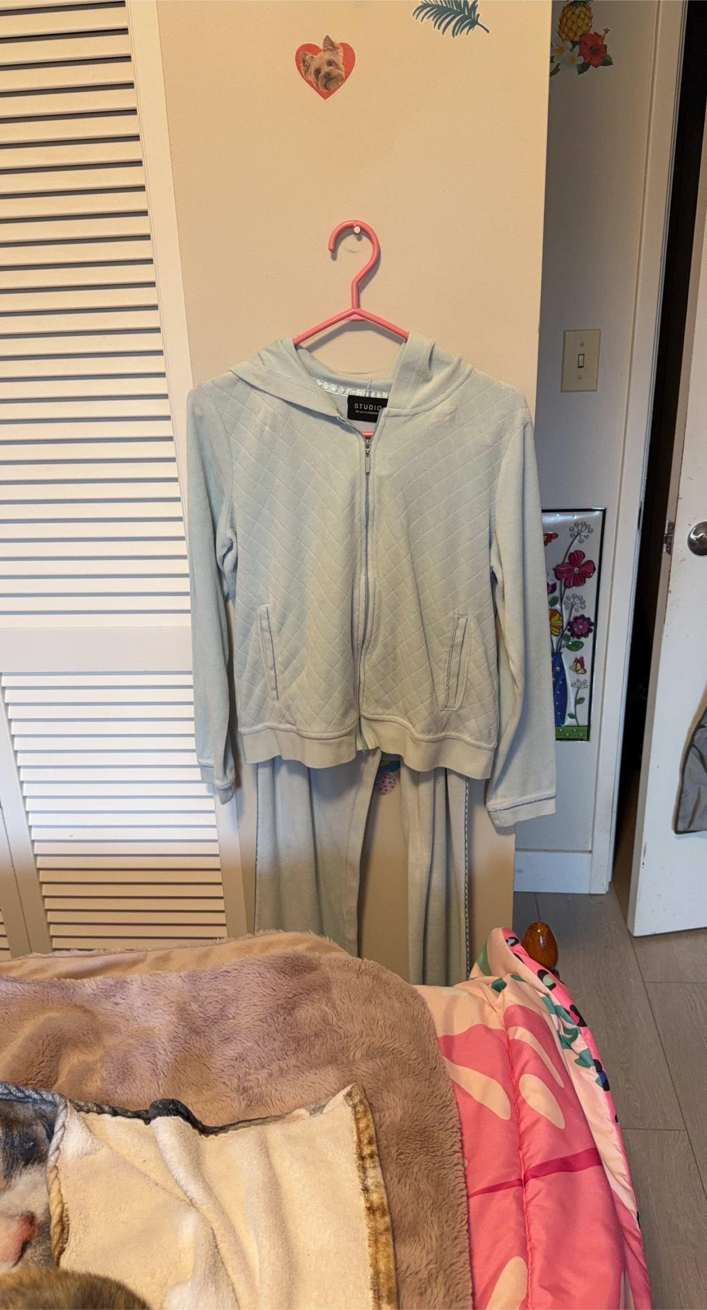 Selling a light blue matching set from Studio by Liz Claiborne. The set includes a zip-up hoodie and pants. It's in great condition!