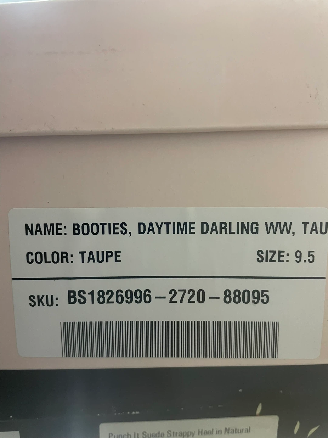 These JustFAB Daytime Darling booties are a strappy heeled style in a taupe colour. Size is 9.5. They're perfect for adding a stylish touch to any outfit. Comes in original box.