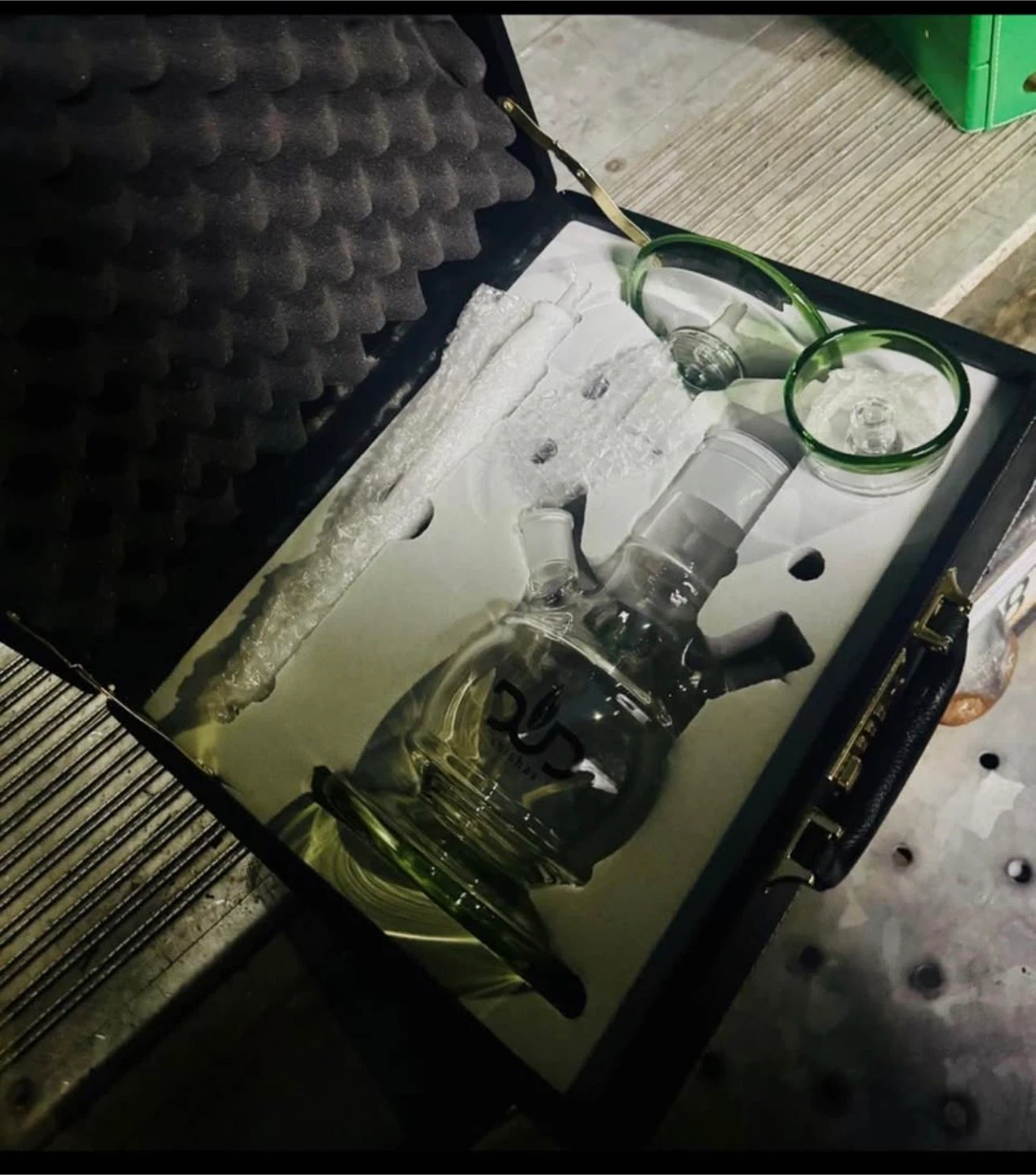 This is a glass water pipe or hookah, complete with a carrying case. It's made of clear glass with green accents. Includes the pipe and accessories in a protective case.