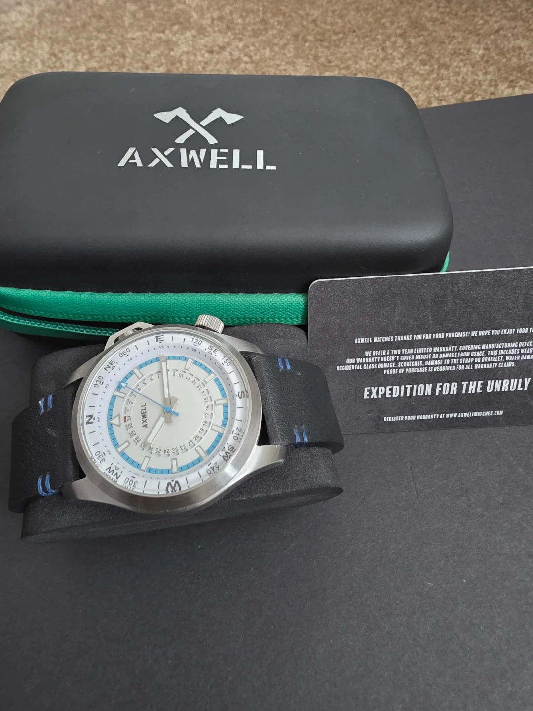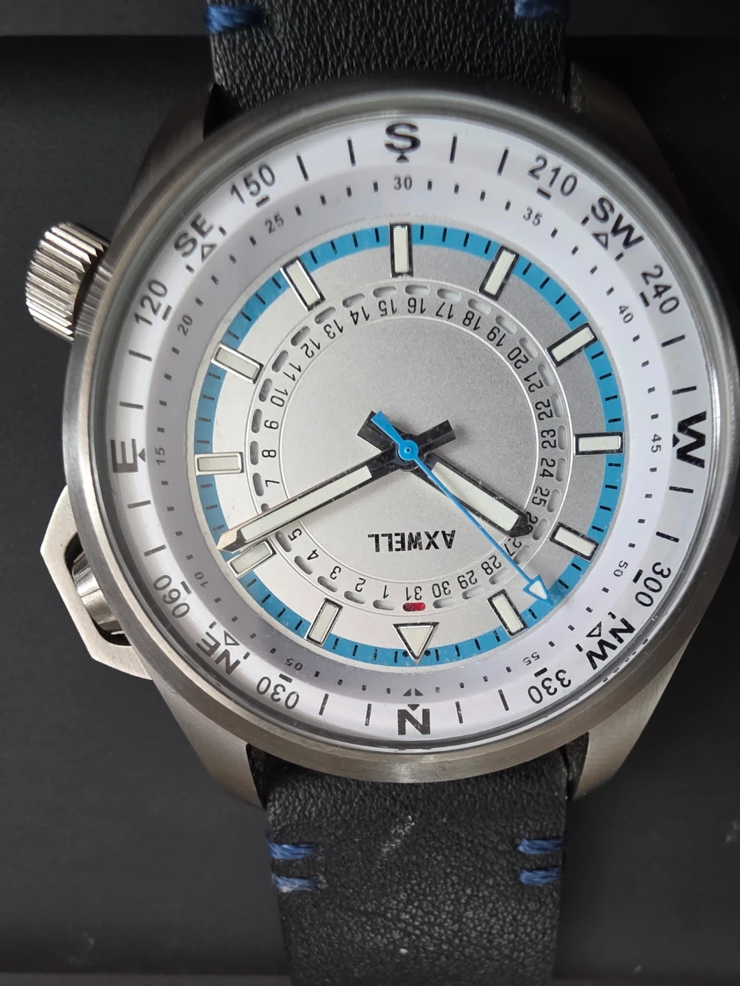 This AXWELL watch features a multi-directional compass bezel and a date complication. It comes with its original case and warranty card. The strap is black leather with blue stitching.