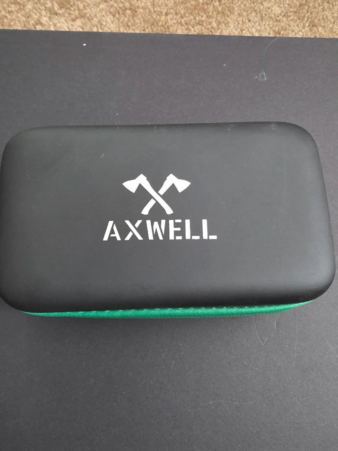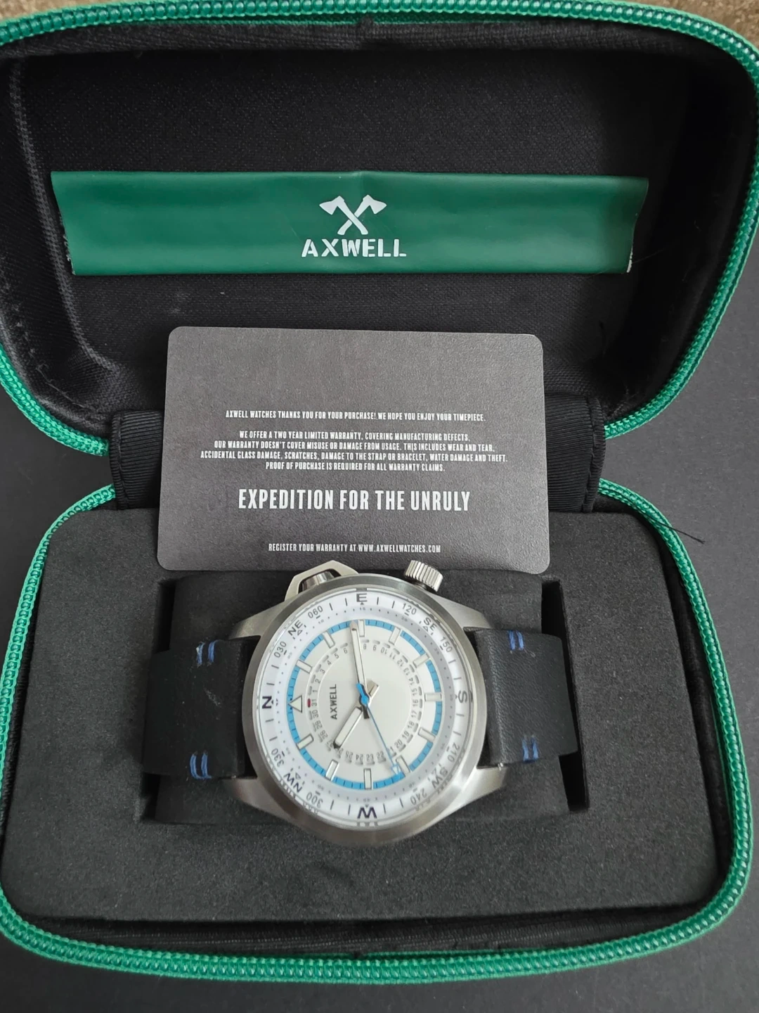 This AXWELL watch features a multi-directional compass bezel and a date complication. It comes with its original case and warranty card. The strap is black leather with blue stitching.