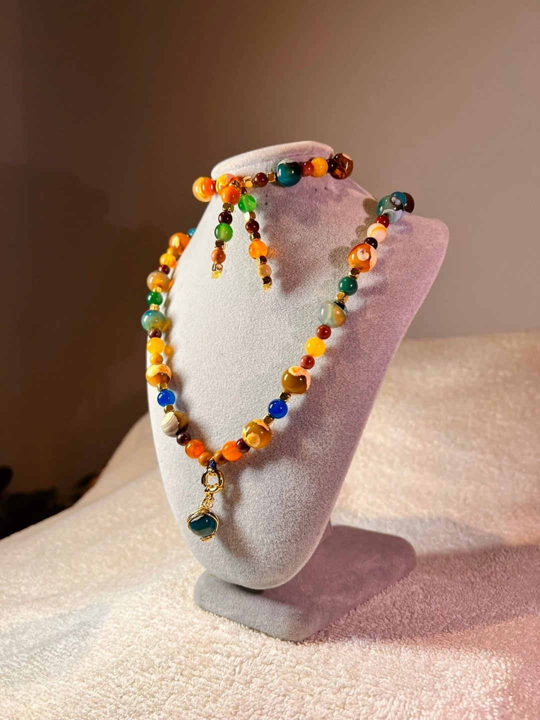 Beautiful Set of Bracelet and Necklace made of Agates, Jasper, Carnelian, and Onyx. Comes in a lovely white box, perfect for gifting or keeping safe. This necklace and bracelet are in excellent condition and ready to add a touch of elegance to your style.✨