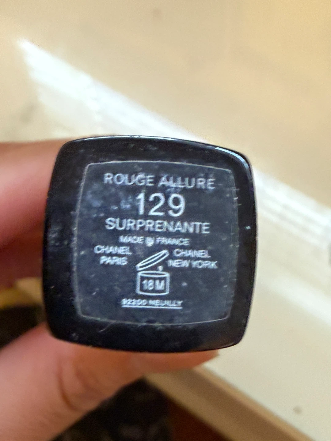This is a Chanel Rouge Allure lipstick in shade #129, 'Surprenante'. It's a classic red shade with a gold and black case. The lipstick is made in France.