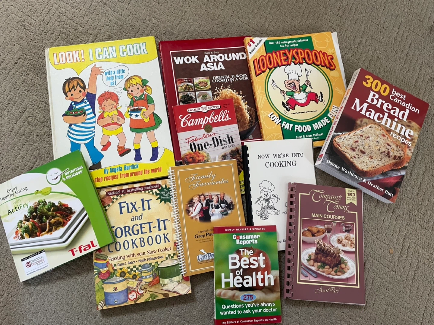 A collection of diverse cookbooks featuring Canadian recipes, slow cooker meals, and healthy eating guides. Titles include 'Look! I Can Cook', 'Wok Around Asia', 'Campbell's Fabulous One-Dish Recipes', 'Family Favourites', 'Fix-It and Forget-It Cookbook', 'Looney Spoons', '300 Best Canadian Bread Machine Recipes', 'Now We're Into Cooking', 'Company's Coming Main Courses', and 'The Best of Health'.