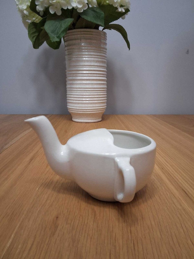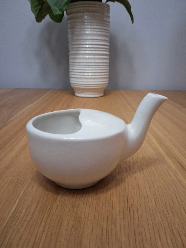 Invalid feeding cup, also known as a pap feeder or hospital cup. These cups were used to feed liquids and broth to individuals who were too weak or ill to feed themselves, including bedridden patients and infants. They were popular in the Victorian era and continued to be used through the early 20th century, including during World War I. The spout allowed patients to drink without spilling, similar to a modern drinking straw. They were used in both homes and hospitals. No chips or cracks. See our other ads.