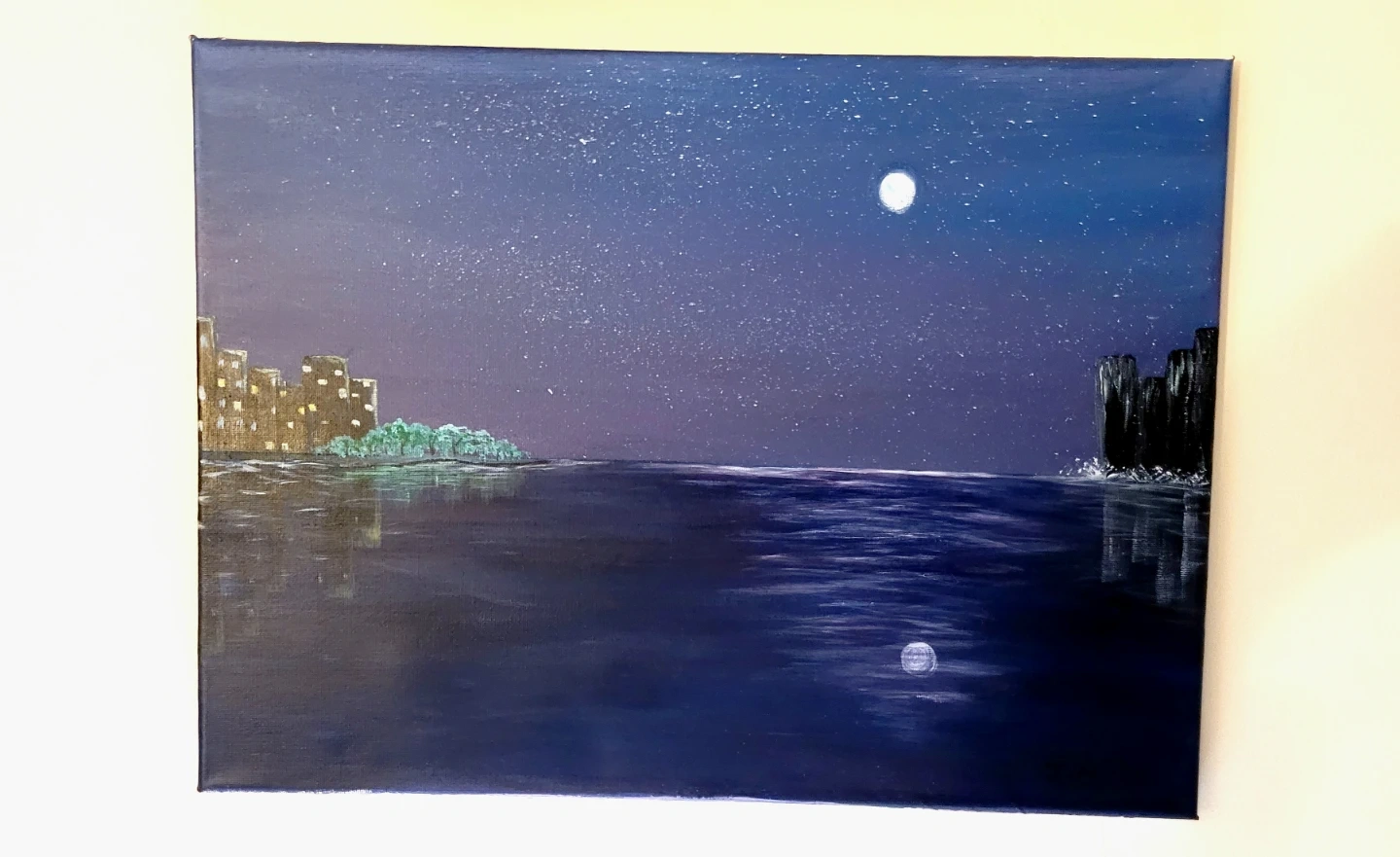A city landscape alongside a large body of water reflected by a full moon with cliffs across the city. Painted by seller.