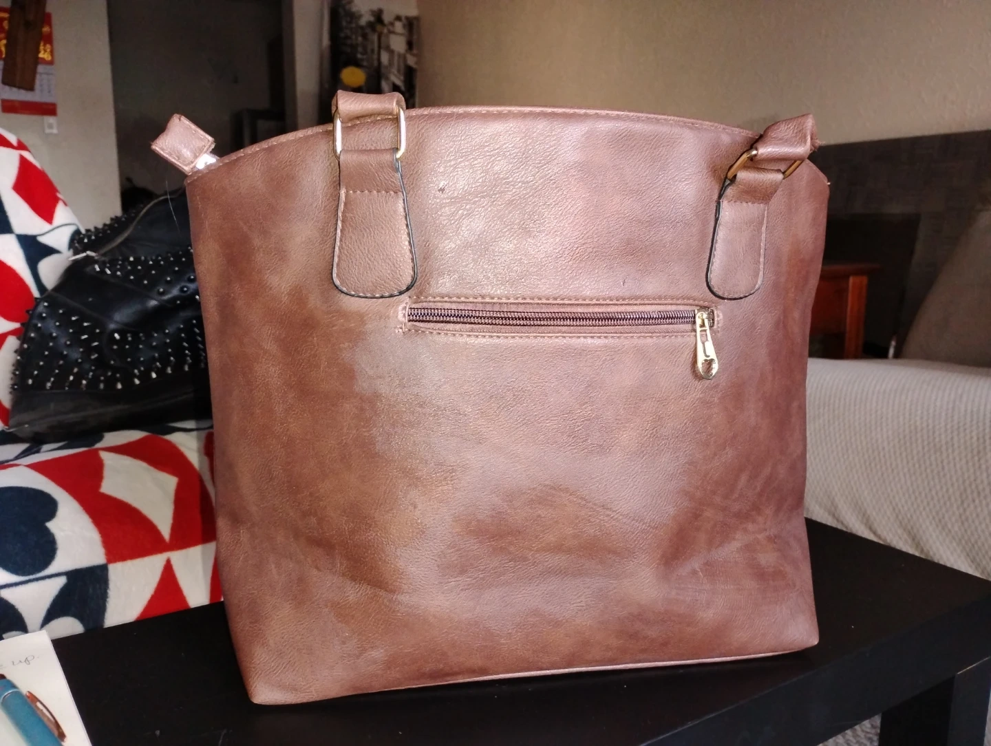 Stylish brown tote bag with quilted stitching and gold-tone hardware. It features a main zippered compartment and an interior zippered pocket. Made from faux leather material.