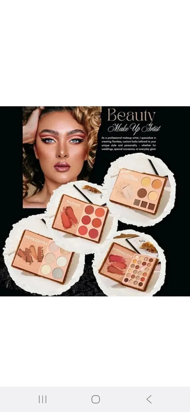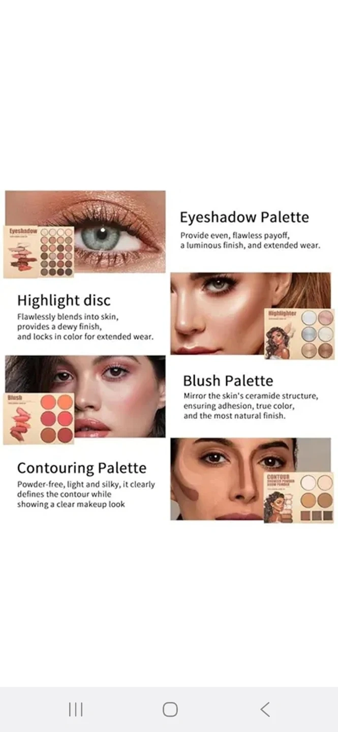 This eyeshadow palette offers a variety of shades for creating different looks. It includes eyeshadows, a highlighter, and blush. The powders are described as powder-free, light, and silky.