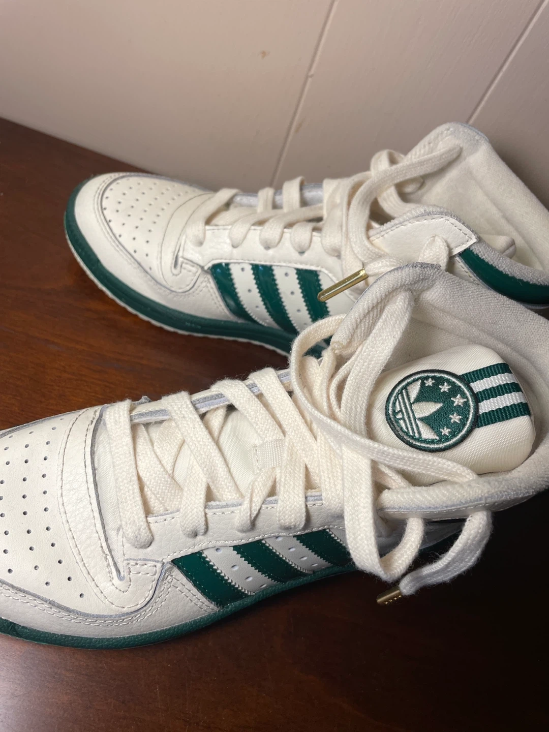 β’ Style: Classic retro mid-top with green stripes and gold lace tips