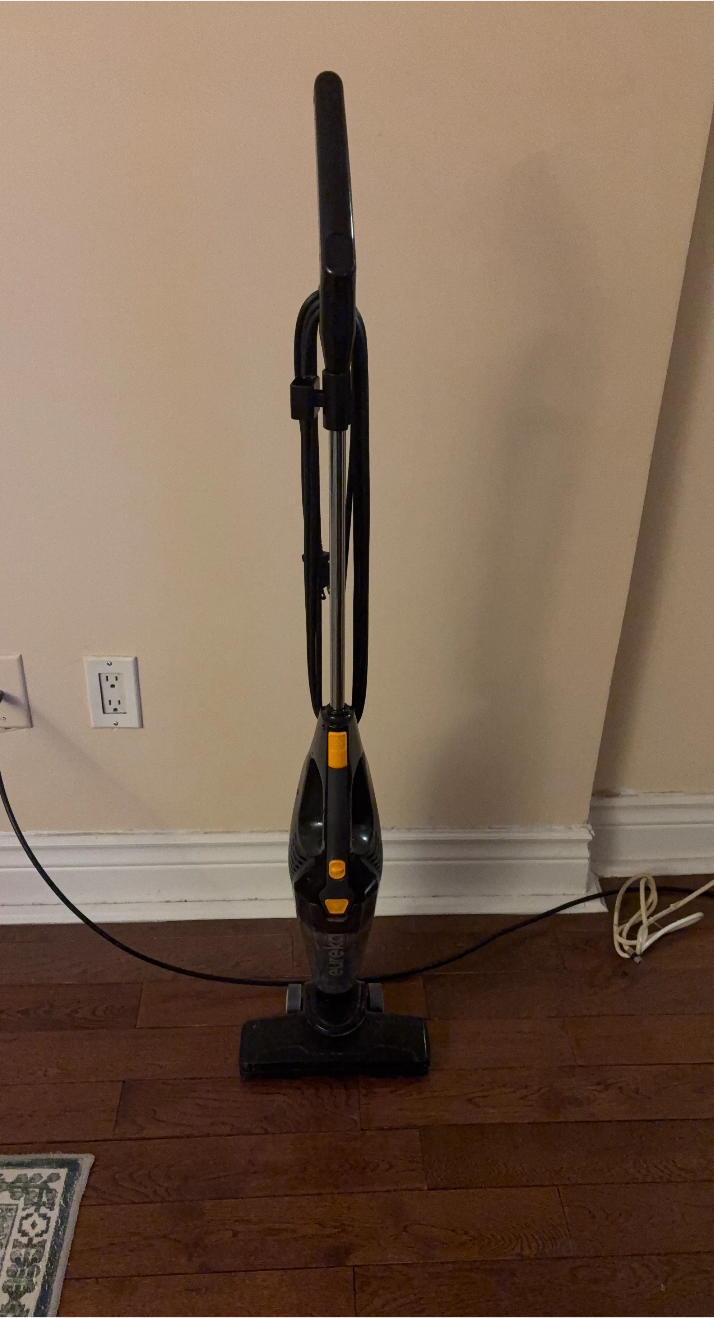 Eureka Mighty Mite vacuum cleaner. It's lightweight and easy to manoeuvre! This vacuum's bagless design makes cleanup a breeze. Corded electric power source.