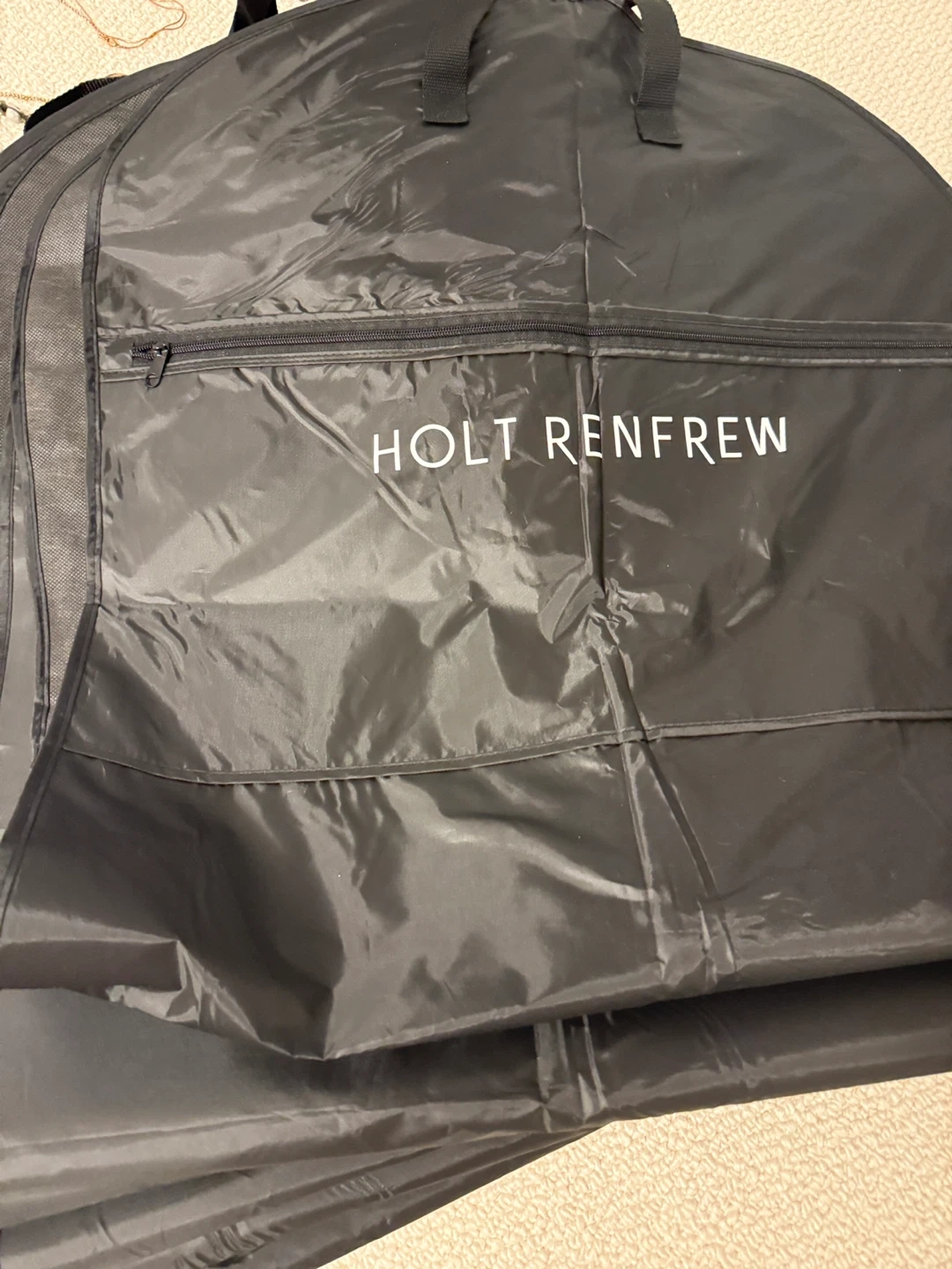This is a durable black garment bag from Holt Renfrew. It's designed to protect clothing during travel or storage. It includes a zippered front for easy access.