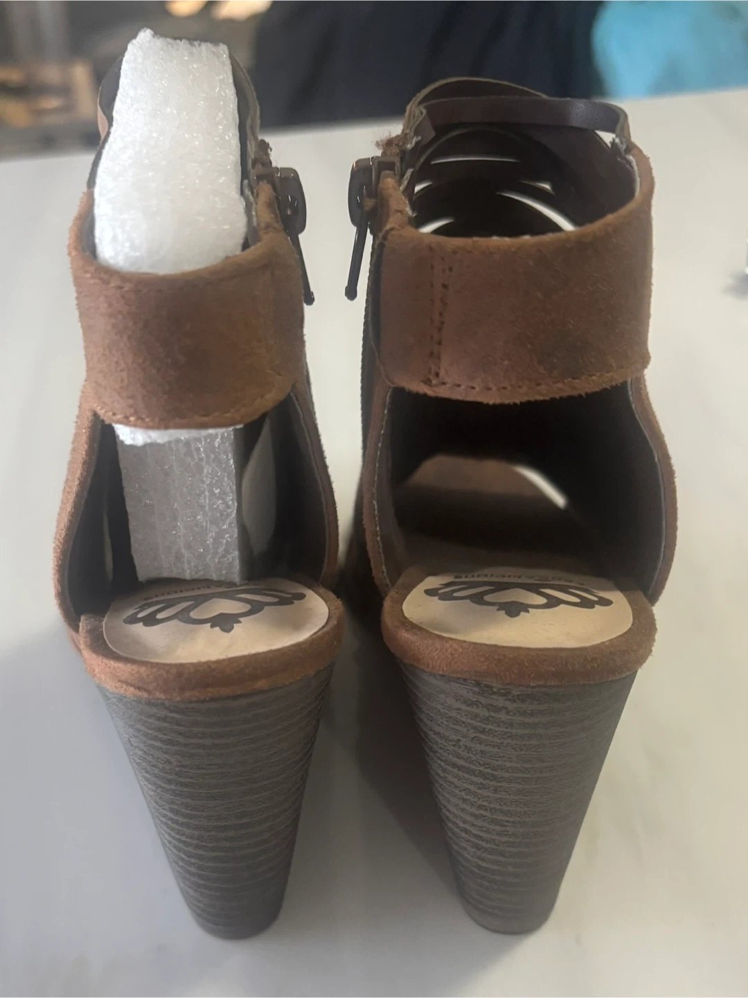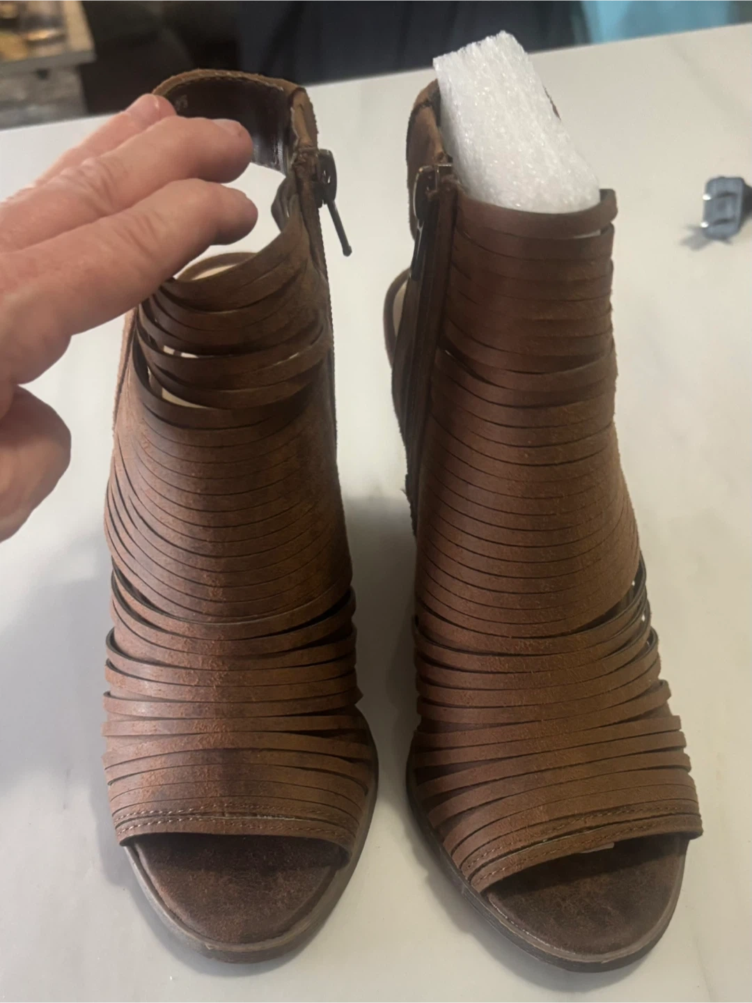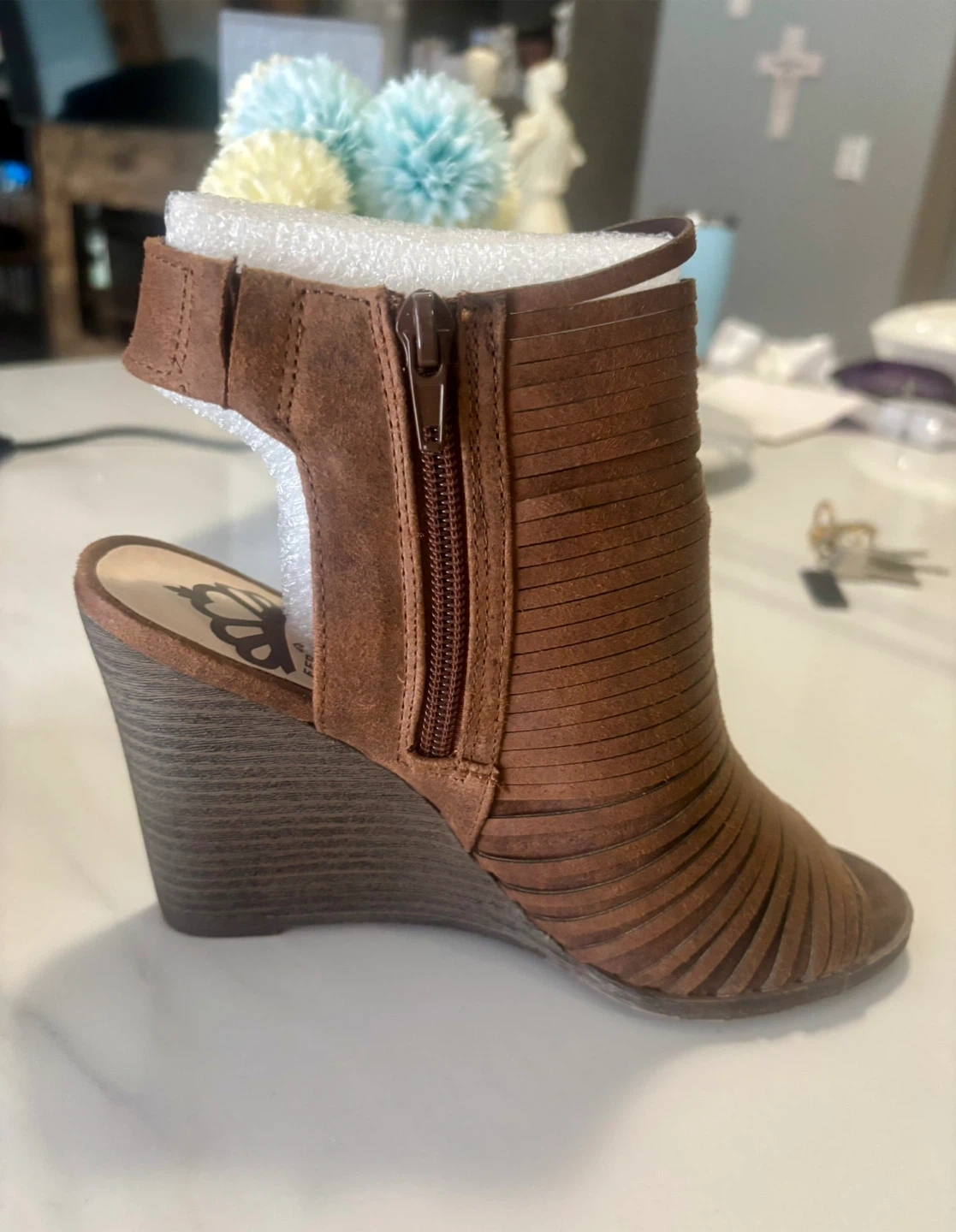 Woven peep toe wedge with open heel and side zip, smooth lining, cushioning insole for all-day comfort. traction outsole.