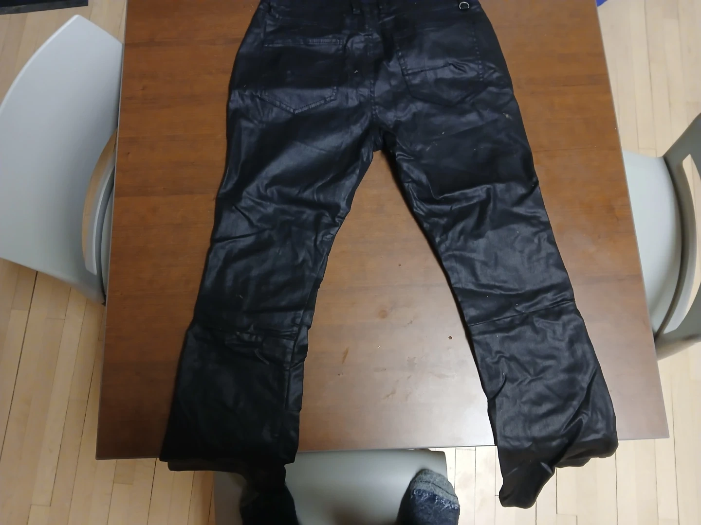 These black jeans have a waxed finish, giving them a shiny look. They're a stylish addition to any wardrobe. Material is denim with a wax coating.