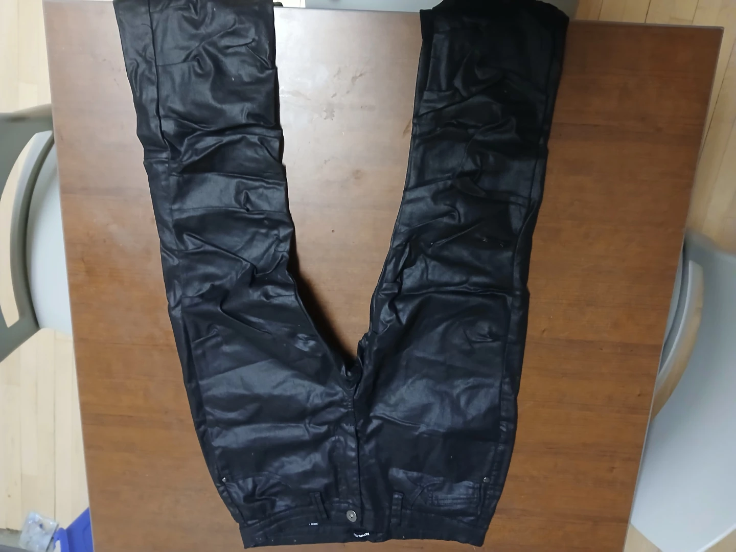 These black jeans have a waxed finish, giving them a shiny look. They're a stylish addition to any wardrobe. Material is denim with a wax coating.