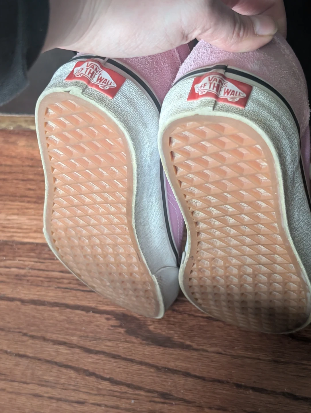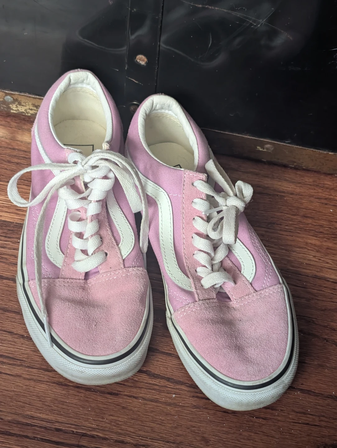 These are pink Vans Old Skool sneakers with suede and canvas uppers. They're a women's size 6.5 (US). Features the classic Vans side stripe and waffle sole.