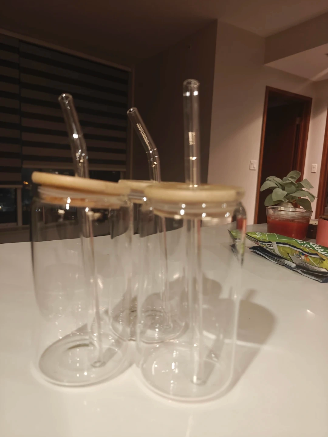 Brand new glass tumblers, come with reusable bamboo lids and glass straws.