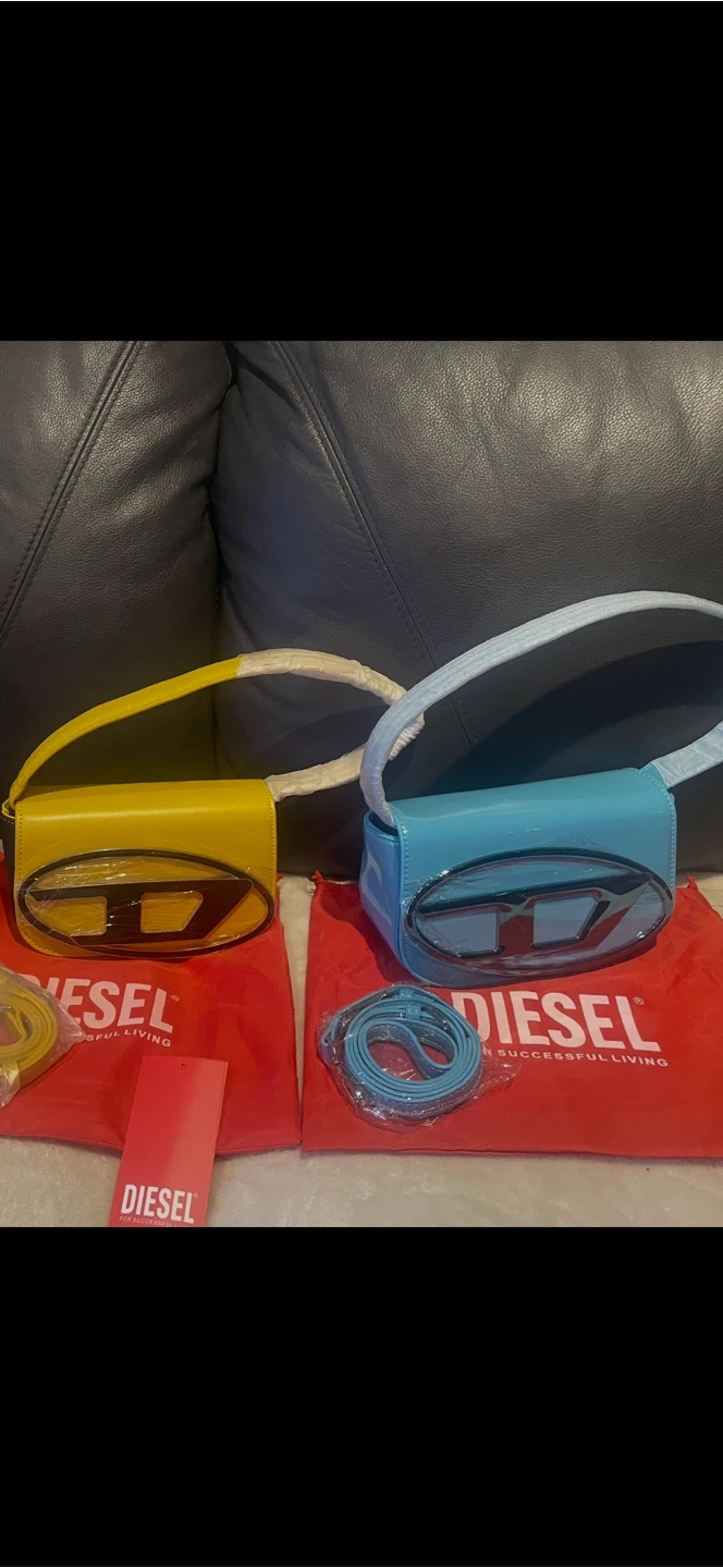 Two Diesel shoulder bags, one in yellow and one in bright blue. Both bags feature the signature Diesel logo on the front. They're made of leather and come with dust bags. Includes detachable straps.