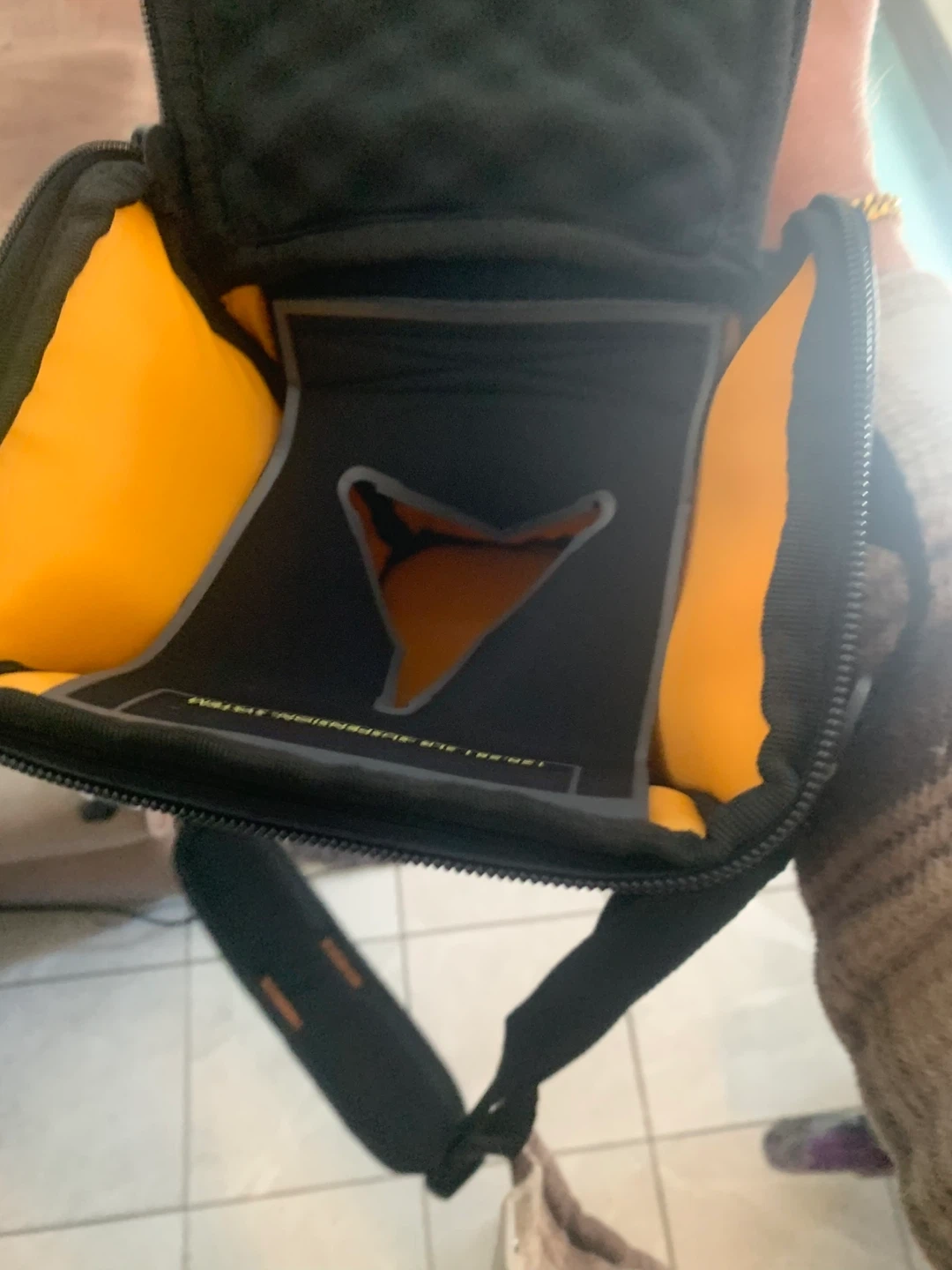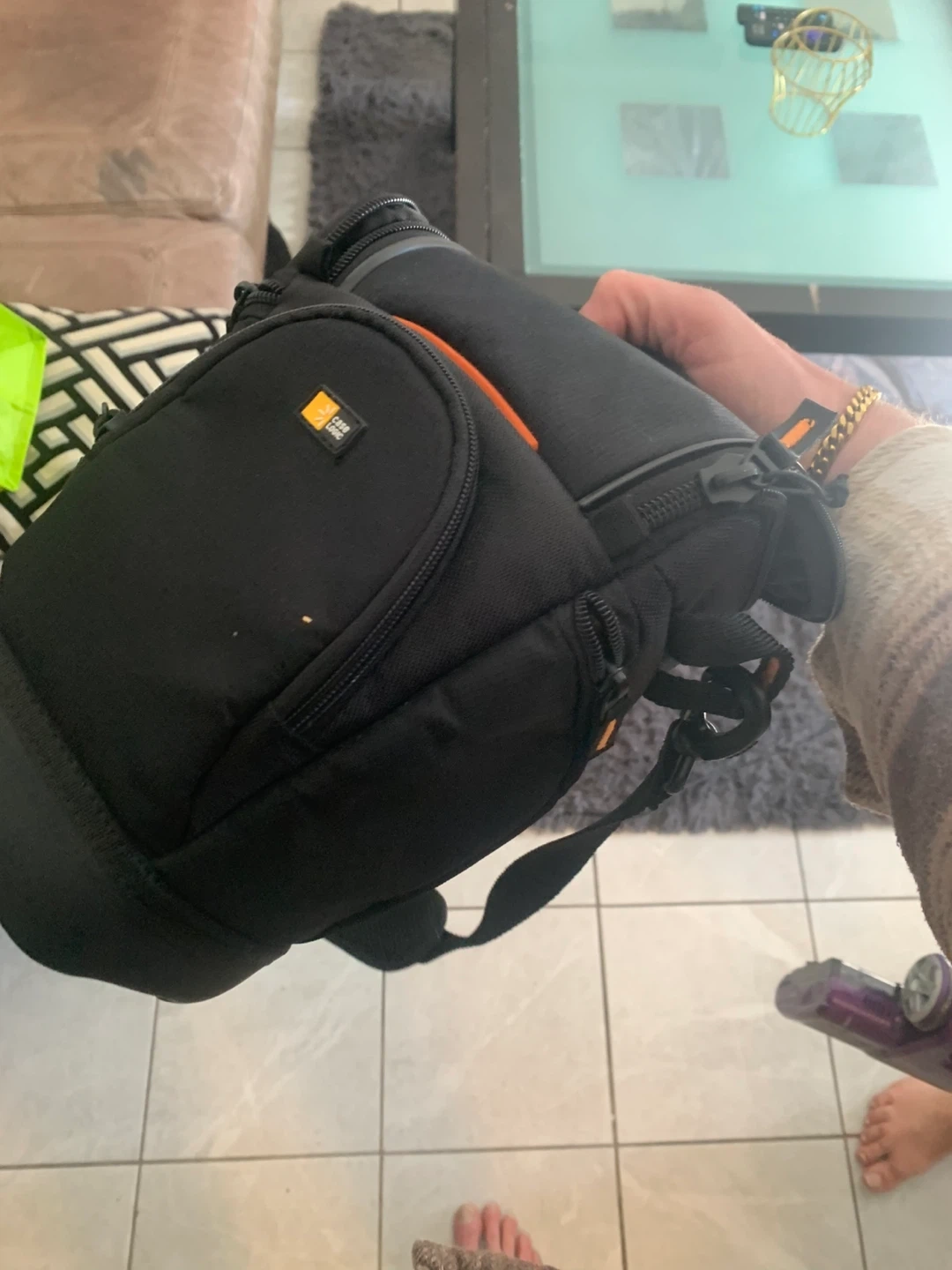 Black and orange CASE LOGIC camera bag with a padded interior. It's suitable for carrying compact cameras or accessories. The bag has a zippered main compartment and a front pocket.