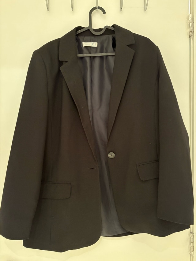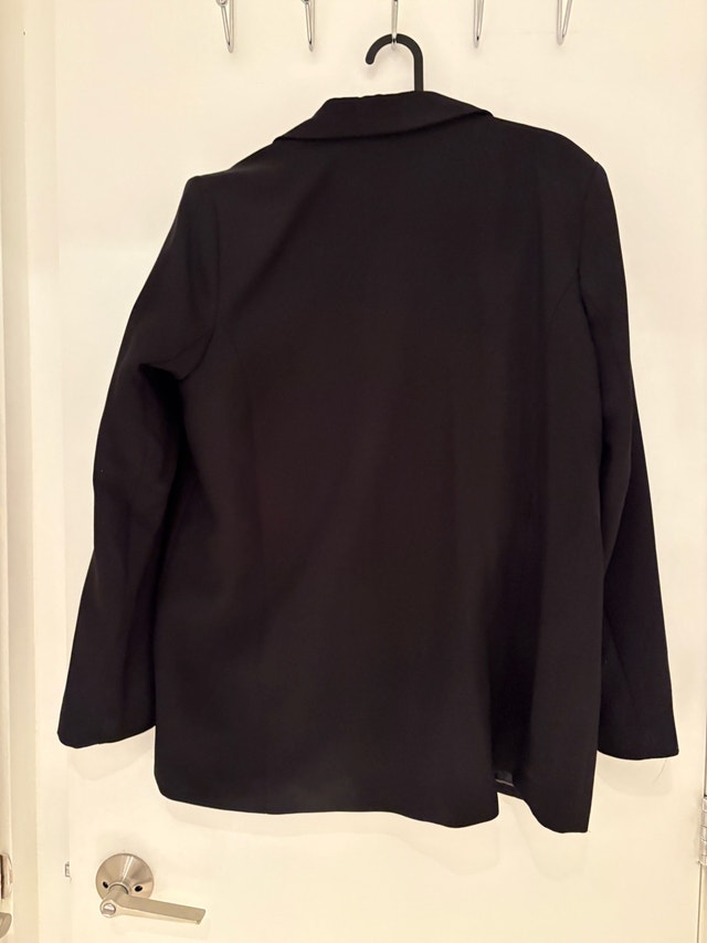 Elegant black blazer with a classic fit. Perfect for office or evening wear. Features a single-button closure. Pick up at King and Portland. Cash only.