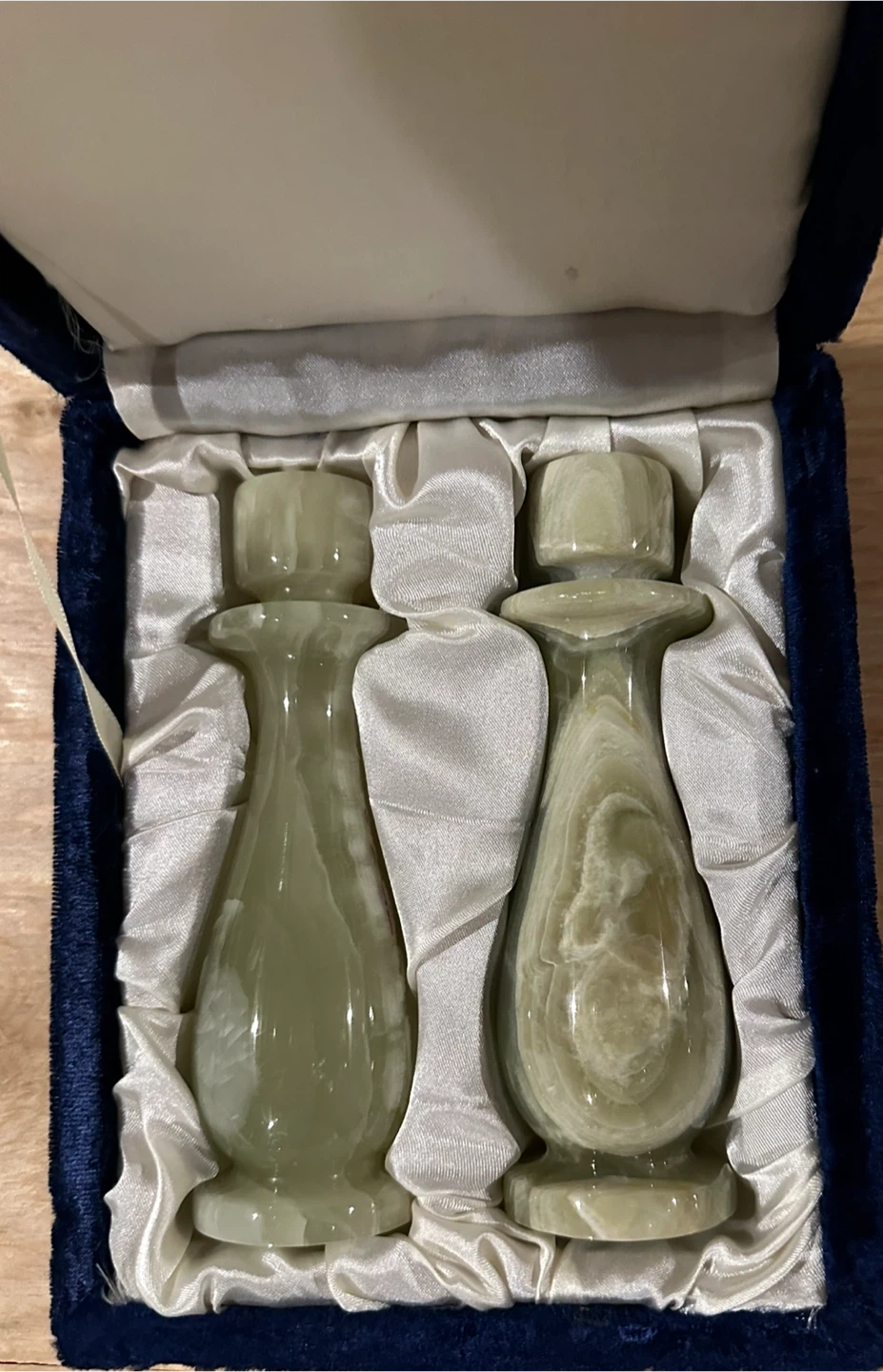 Selling a pair of vintage onyx candle holders! They come in a beautiful dark blue velvet box with satin lining. These unique candle holders would add a touch of elegance to any room