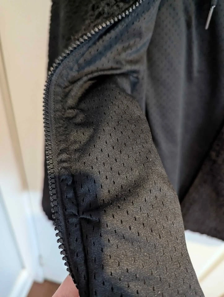 Cozy black sherpa jacket with zip-up front. Features a hood and zippered pockets. Excellent condition, worn once. Torso length: 26 inches, Chest: 20 inches, Hips: 21 inches, Sleeve length: 22 inches.