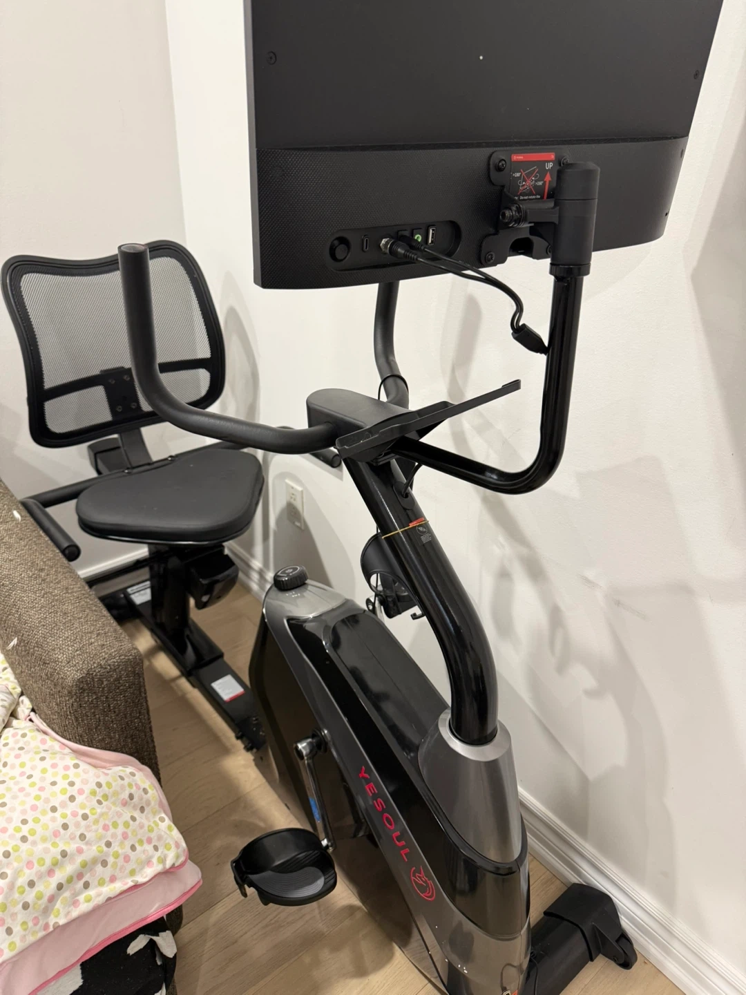 This YESOUL stationary exercise bike features a comfortable mesh back seat and adjustable handlebars. It comes with a screen and power adapter. Great for home workouts!