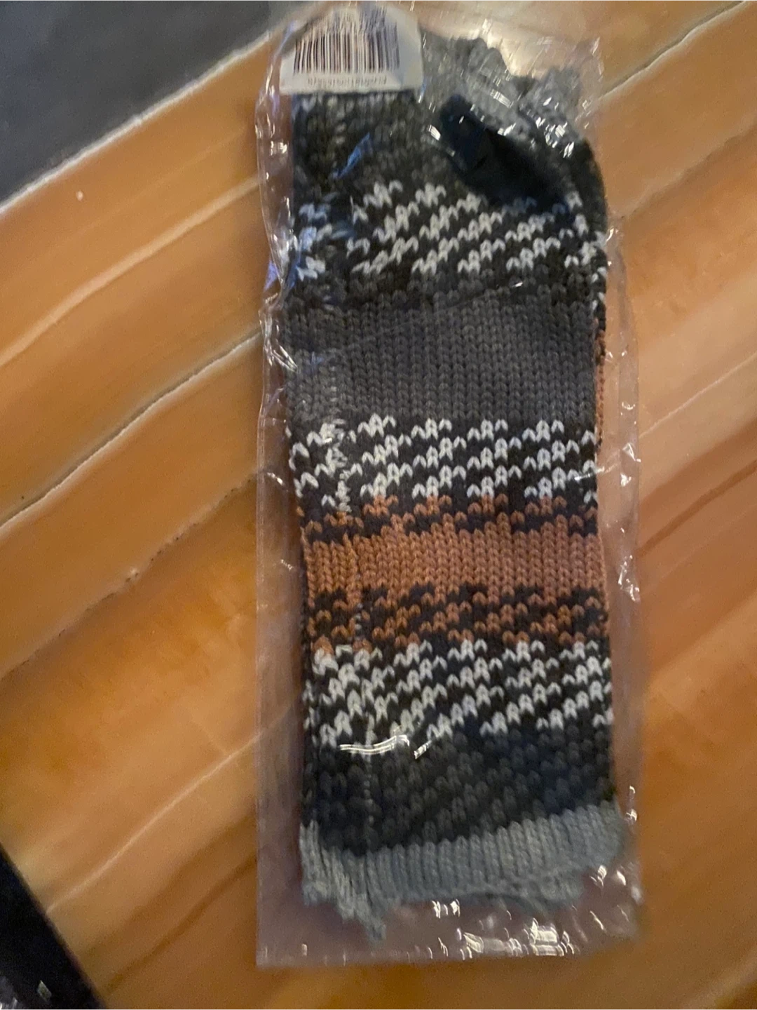 pair of handmade knitted arm warmers. Brand, new, and feature a unique pattern with gray, brown, and white colors. Perfect for keeping your arms - legs warm and cozy!