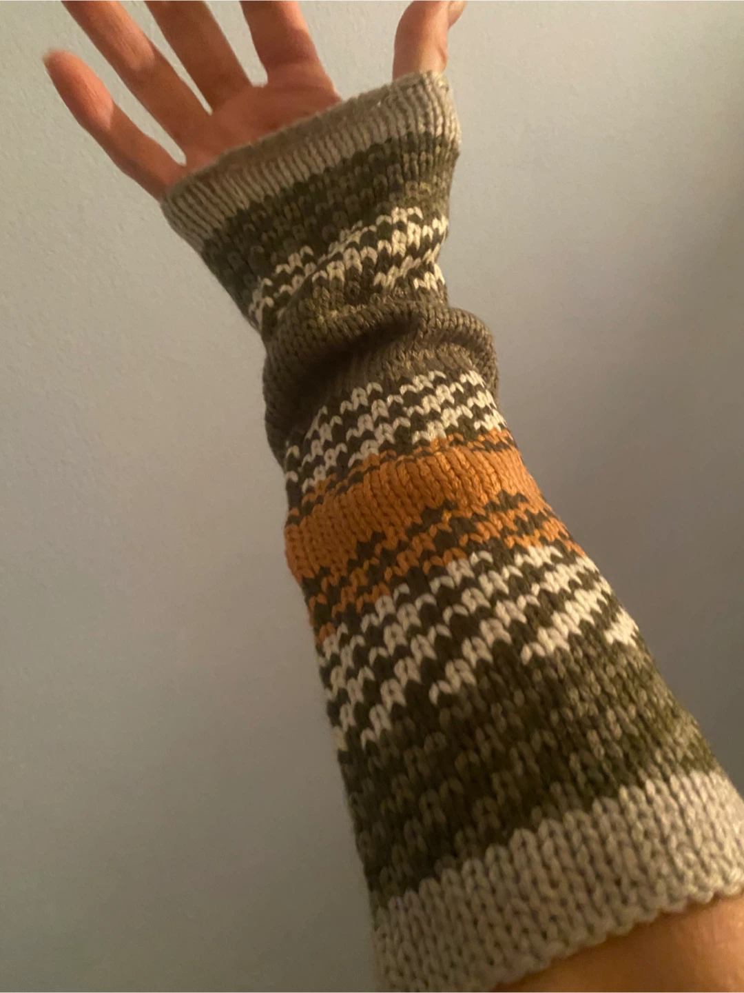 pair of handmade knitted arm warmers. Brand, new, and feature a unique pattern with gray, brown, and white colors. Perfect for keeping your arms - legs warm and cozy!