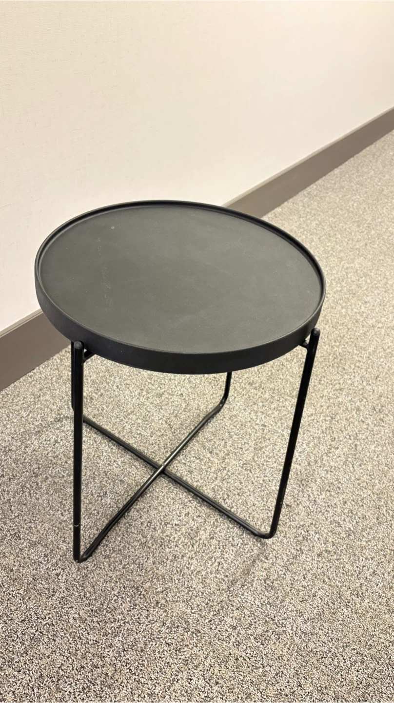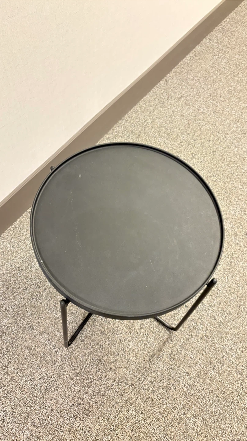 This is a black round side table. It has a metal frame and a removable tabletop. It's foldable for easy storage. The tabletop has a unique patterned underside.