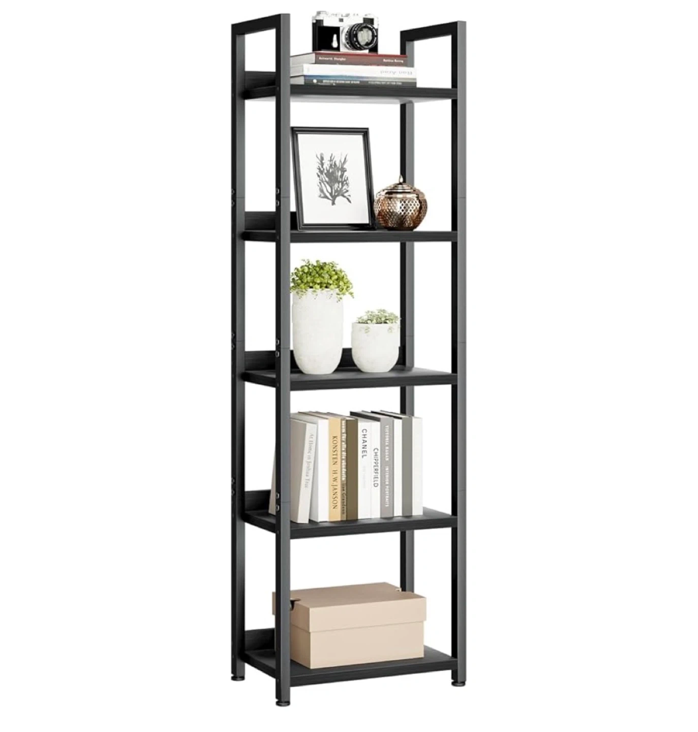 This 5-tier black metal bookcase offers ample storage space. Each shelf supports up to 30 lbs. Its dimensions are 15.4"W x 10.6"D x 55.5"H. It's perfect for organizing books and decor.
