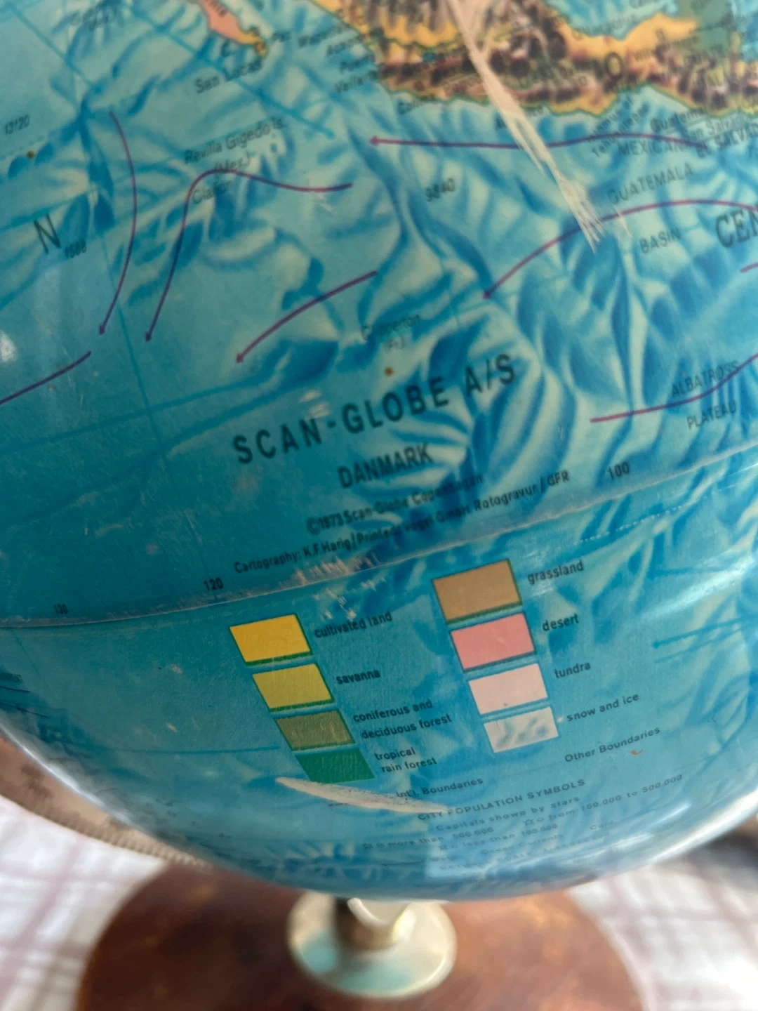 Selling a Scan-Globe A/S Danmark globe! It's a great piece for any home or office. The globe features detailed cartography and is mounted on a wooden base. It shows various geographical features and city population symbols! A perfect educational tool or decorative item
