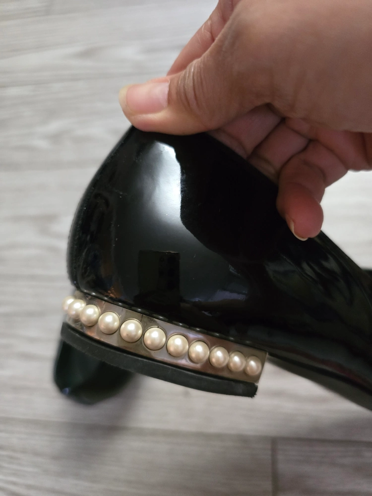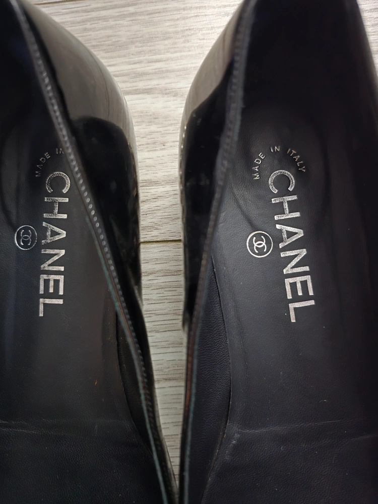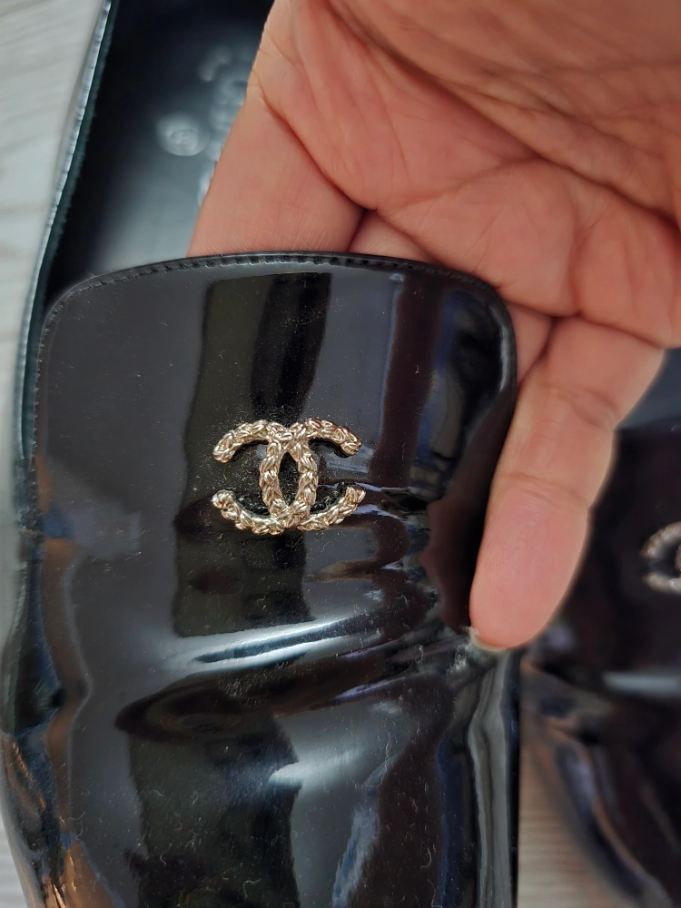 These are a pair of Chanel black patent leather loafers. They feature the iconic Chanel logo on the front and a pearl detail around the heel. Made in Italy.