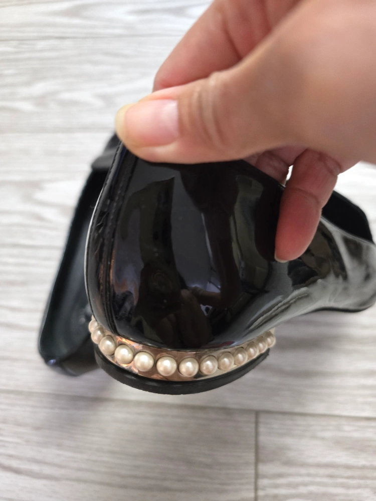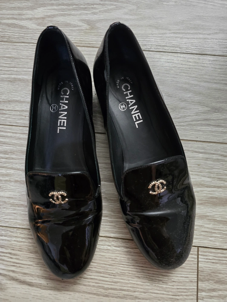 These are a pair of Chanel black patent leather loafers. They feature the iconic Chanel logo on the front and a pearl detail around the heel. Made in Italy.
