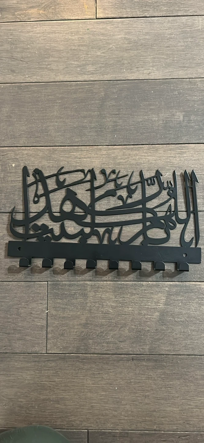Black metal wall-mounted key holder featuring intricate Islamic calligraphy. It has eight hooks for organizing keys. A decorative piece for any entryway or hallway.