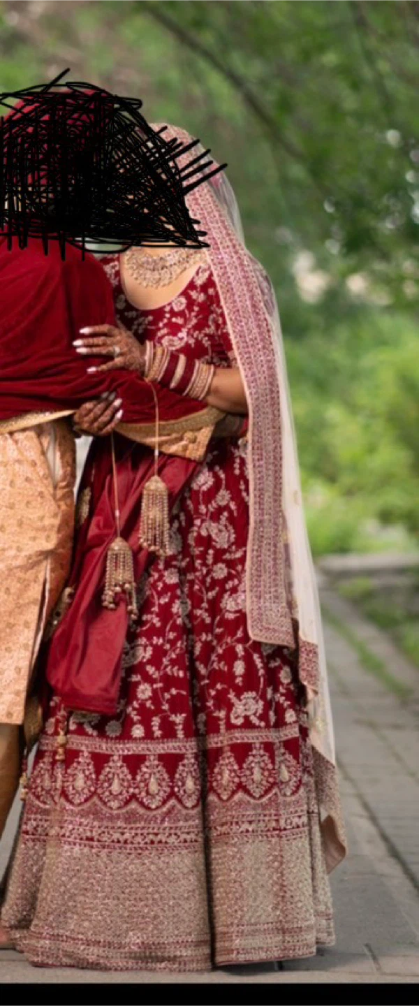Beautiful red lehenga with intricate gold embroidery all over. It's a traditional outfit perfect for weddings and special occasions. Includes a matching dupatta with a decorative border. This outfit is made from rich fabric and is heavy.