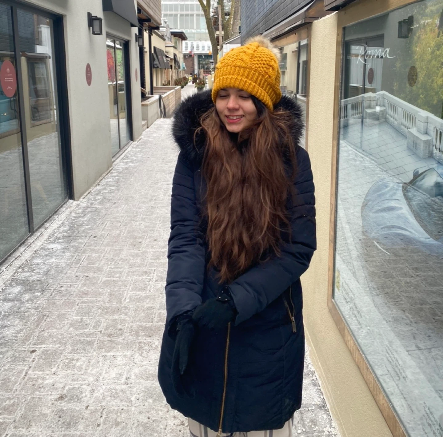 This navy blue puffer coat is designed for warmth and style. It features a chevron quilting pattern and gold-tone zipper accents. The hood is trimmed with faux fur for added coziness.