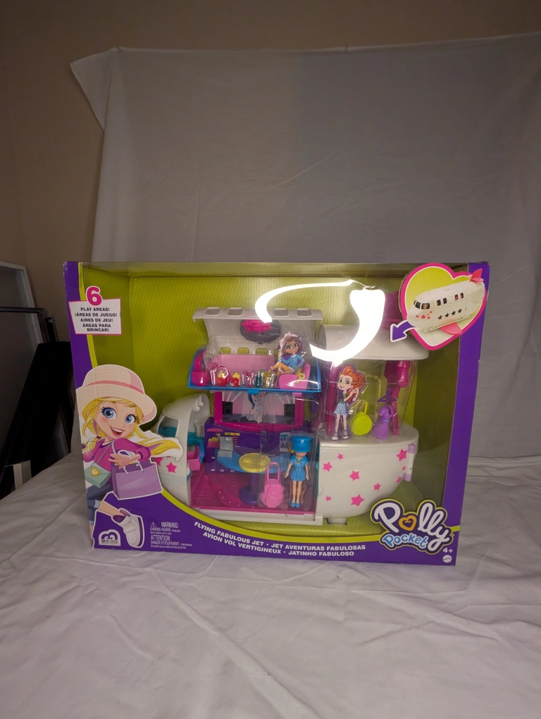 Selling a Polly Pocket Flying Fabulous Jet playset! It's a super fun airplane that opens up to reveal different play areas. Perfect for little ones who love imaginative adventures. Recommended for ages 4+