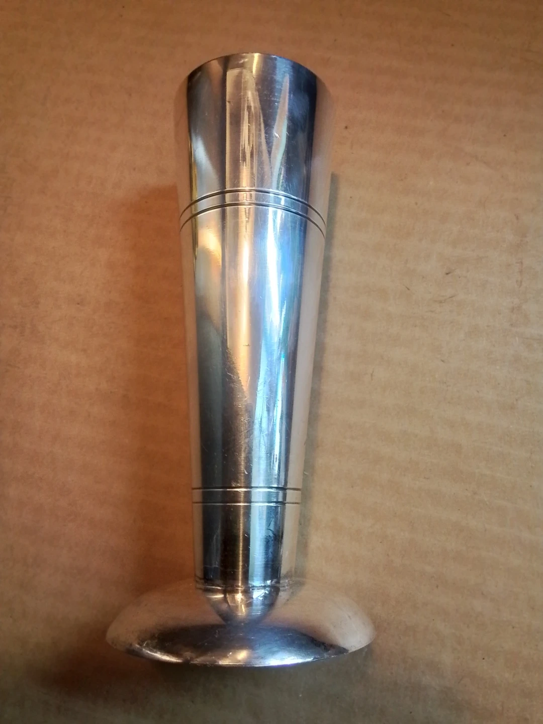 I'm offering a vintage Danish silver-plated vase by H O Hansens Sølvsmedie, standing 6 inches tall, in good condition. This elegant vase features a sleek, tapered design with subtle detailing, perfect for adding a touch of Scandinavian sophistication to any space. It's a lovely piece for collectors or anyone who appreciates fine craftsmanship.