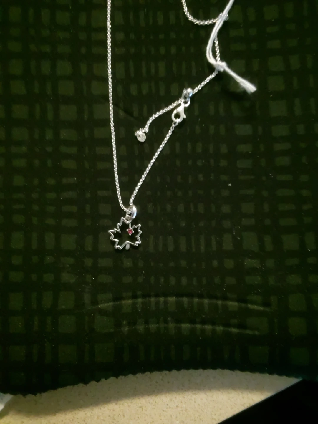 Pandora silver 925 necklace features a charming maple leaf pendant with a small red accent stone. It has an adjustable chain and a secure clasp. It's a lovely piece for everyday wear or to add a touch of nature to your outfit!