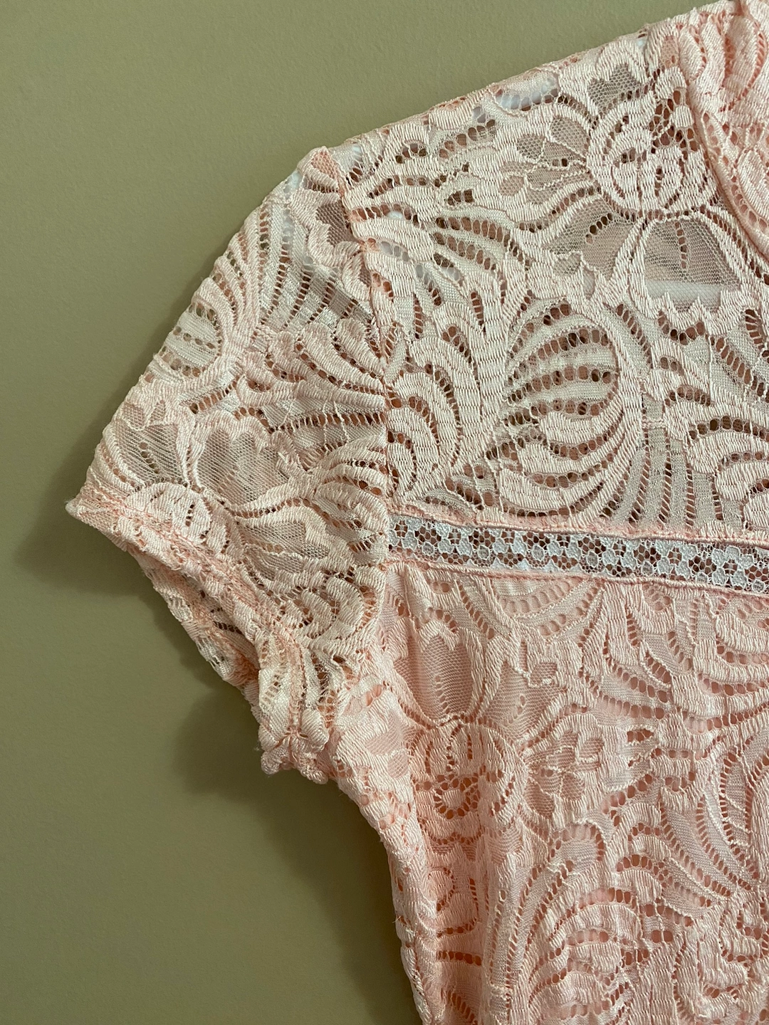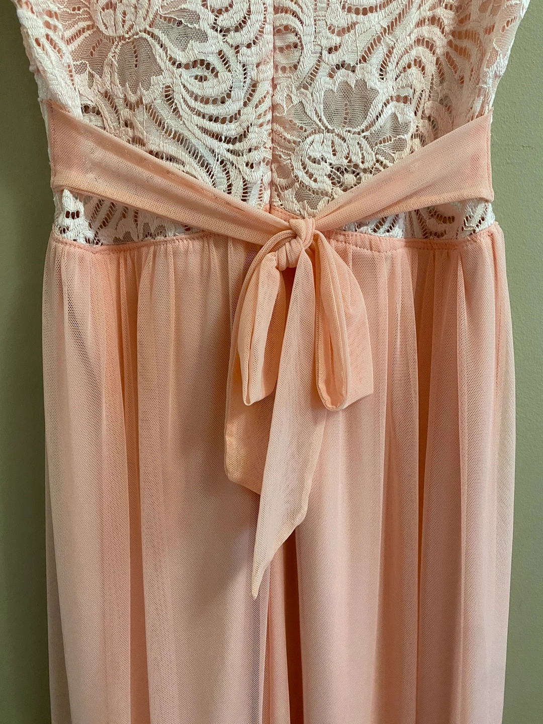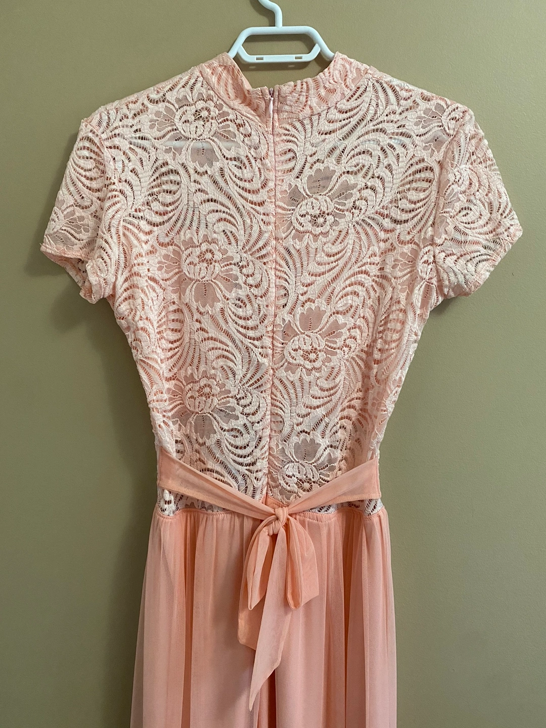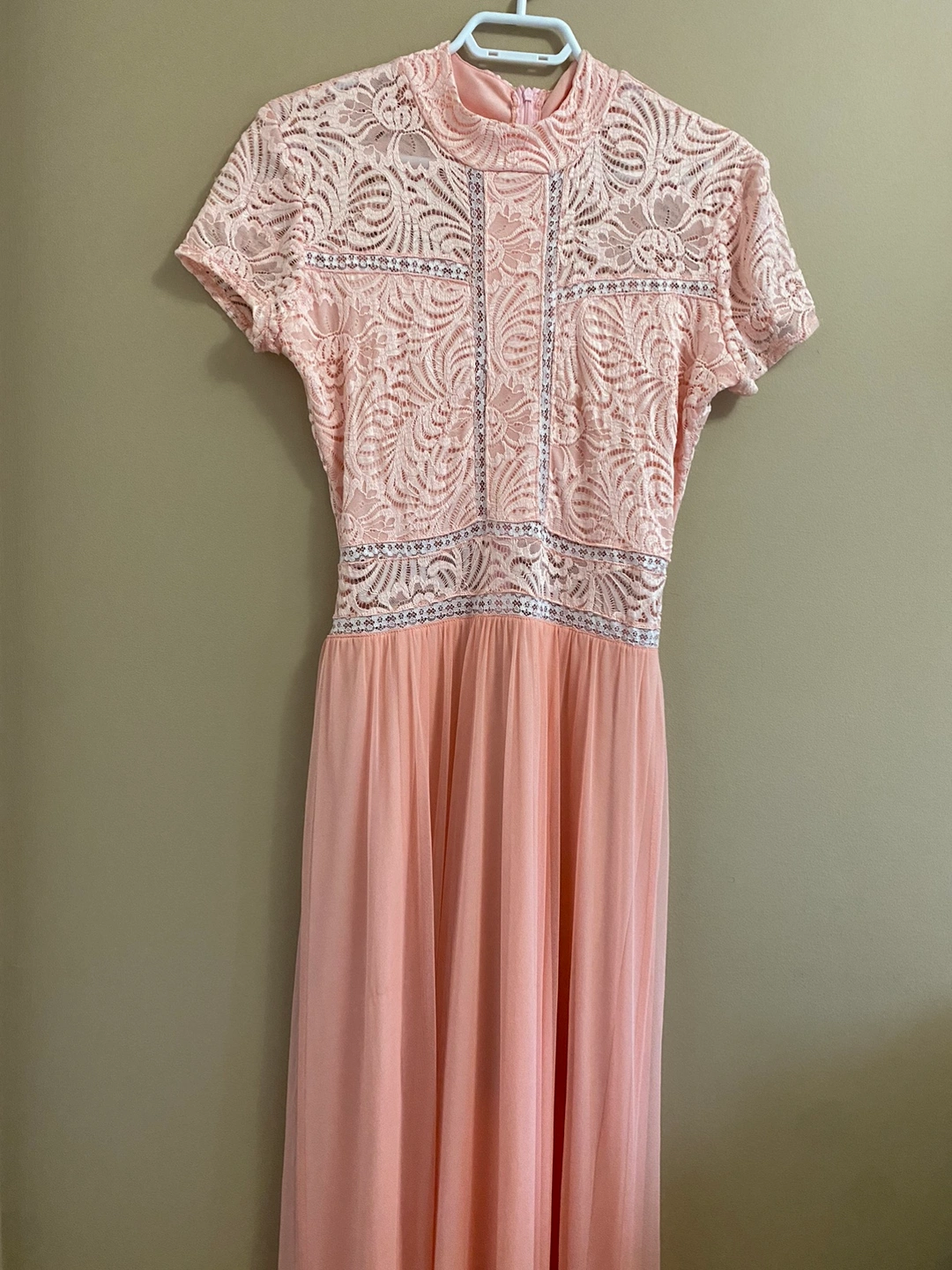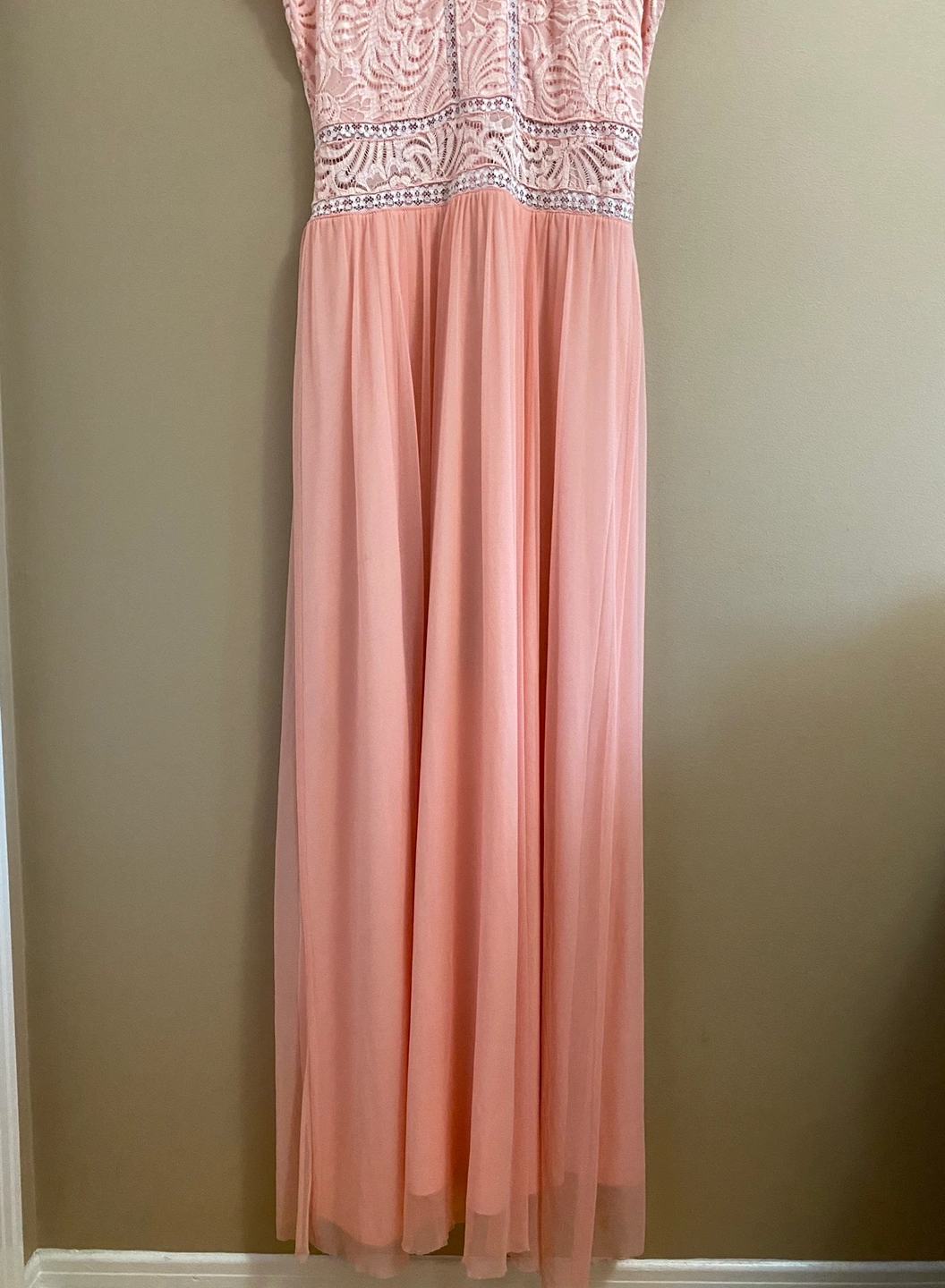Gorgeous maxi dress with a lace bodice and chiffon skirt. The dress is a beautiful light/baby pink colour. The upper torso has a beautiful floral lace design and the bottom skirt is a soft and flowing chiffon. Perfect for a special occasion!